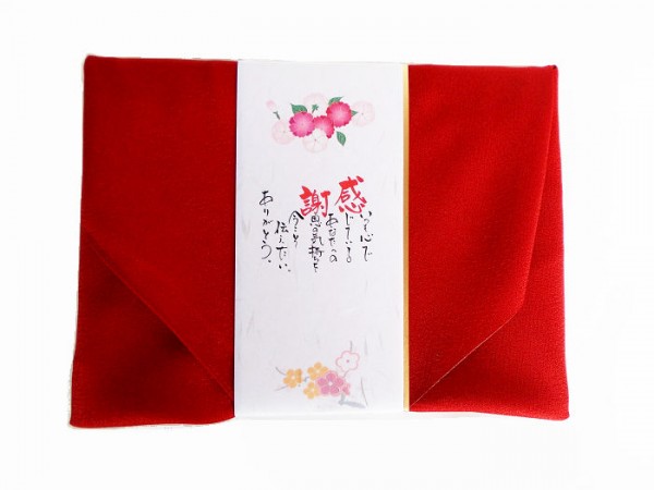 風呂敷は赤色と金色のリバーシブルを選択しました。風呂敷は全商品、シンプルな平包みです。