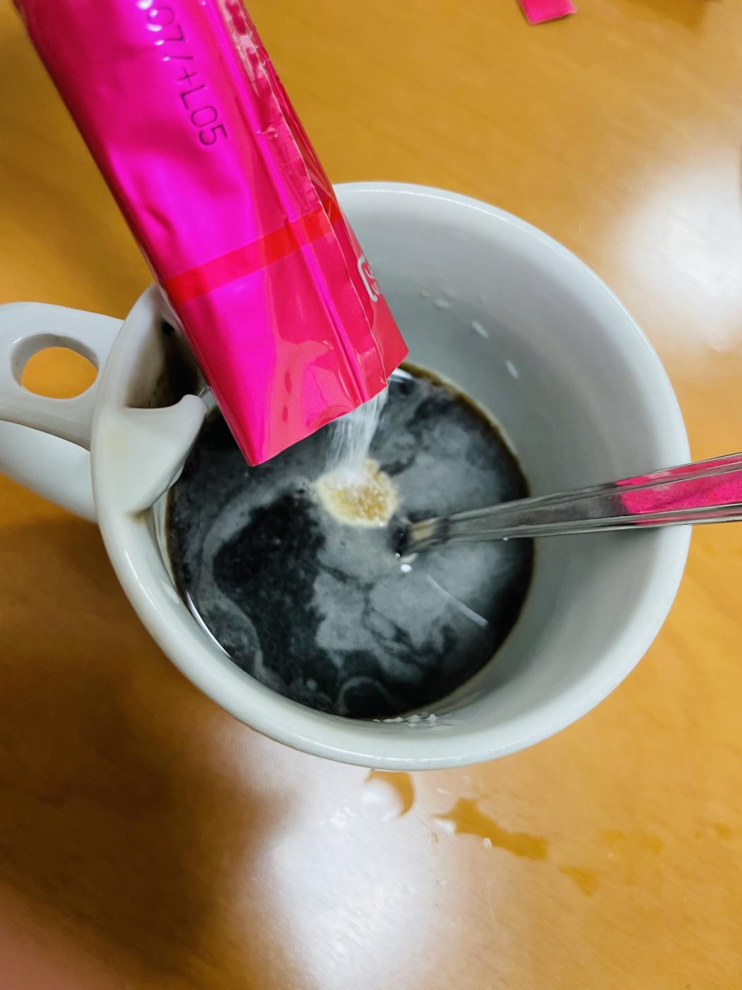 可愛い個包装を開けると、白い粉が入っています。料理や飲み物に溶かせるということなので、早速コーヒーに溶かしてみました。冷蔵庫内にあったアイスコーヒーに入れましたが、溶け残りも無くすぐに溶けてくれました。