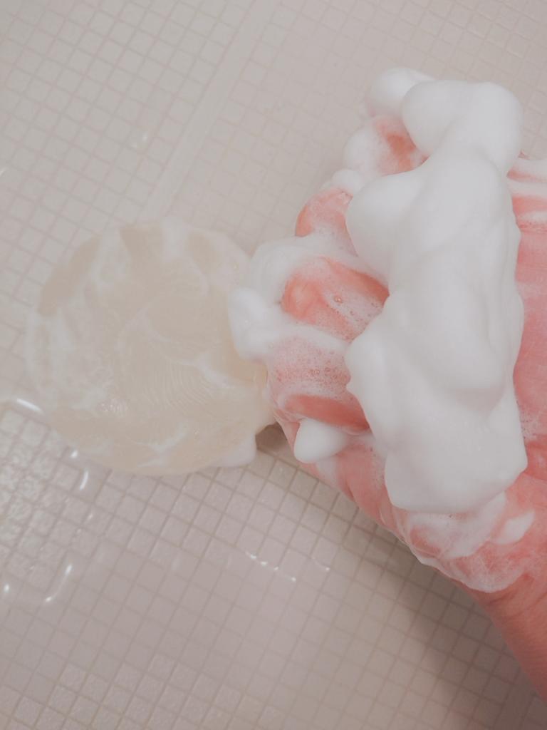 洗顔ネットを使うと、もっちもちの、ふわふわな泡が完成しました。