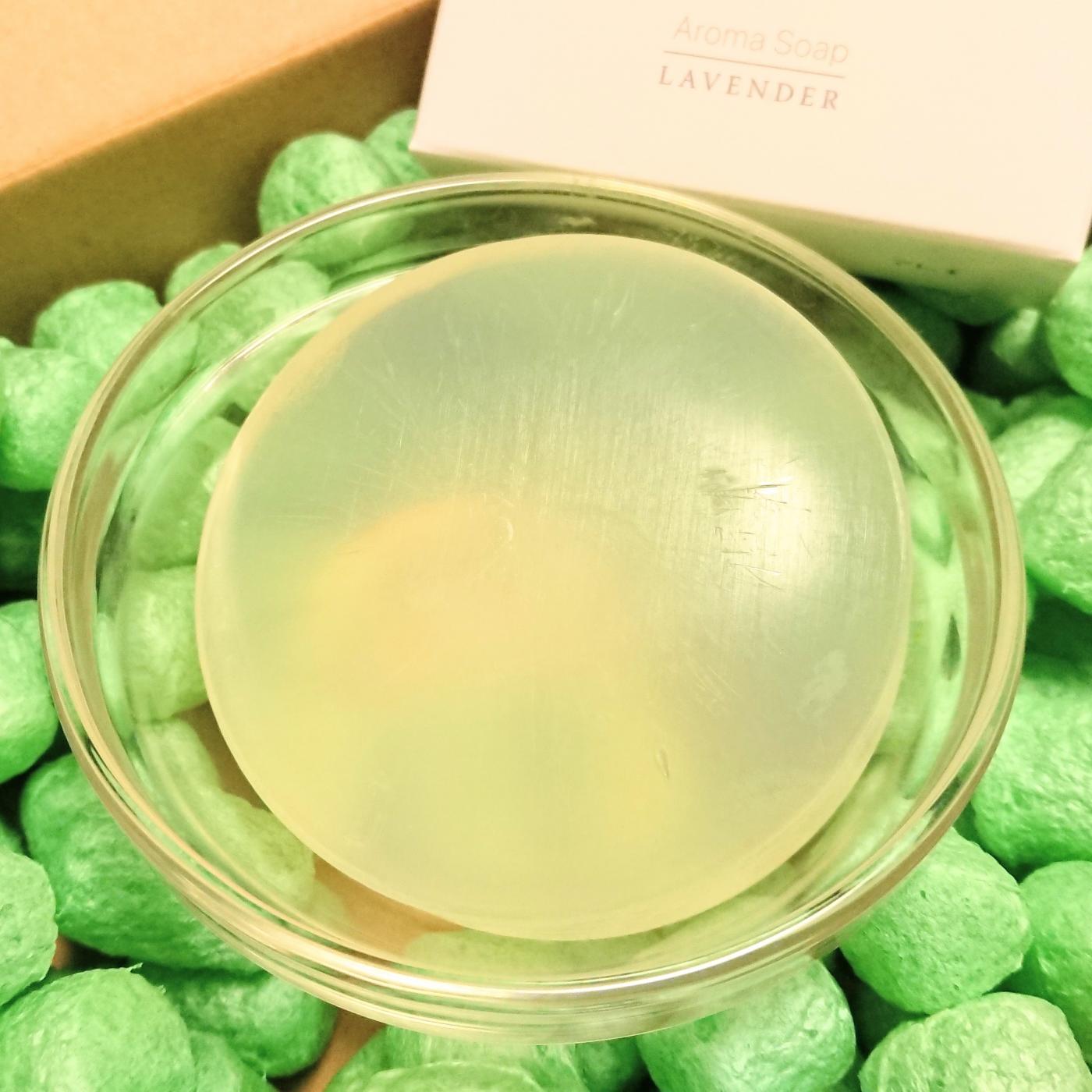 少し淡く色のついた、半透明の石鹸が登場。この時点で、ふんわりとラベンダーの香りがしてきます?