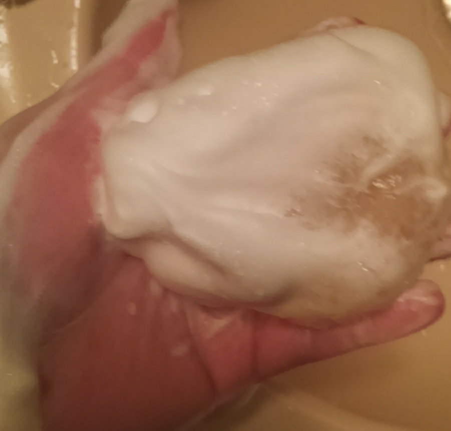 ぬるま湯で濡らした石鹸を両手でよく転がし、水を数滴ずつ加えながら泡立てます。