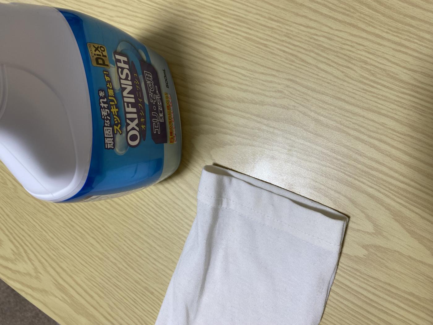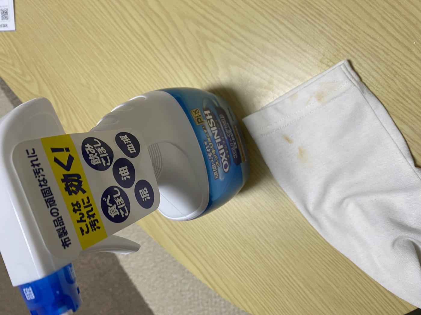 説明通り、洗濯機で洗う前に一度オキシフィニッシュの泡を吹きつけて少し置いた後に洗濯。泡で出てくるので今までやっていた手洗いのように洗剤の偏りが生まれにくく、比較的広範囲の汚れにも対応できそうです。