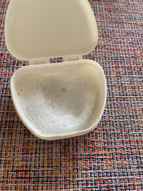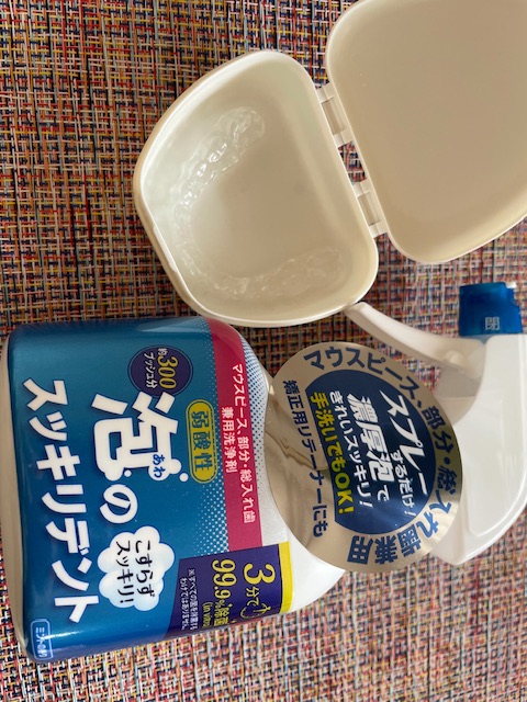 マウスピースのお手入れですが、朝ケースに入れ、時々ポリデントにつけていました〜。