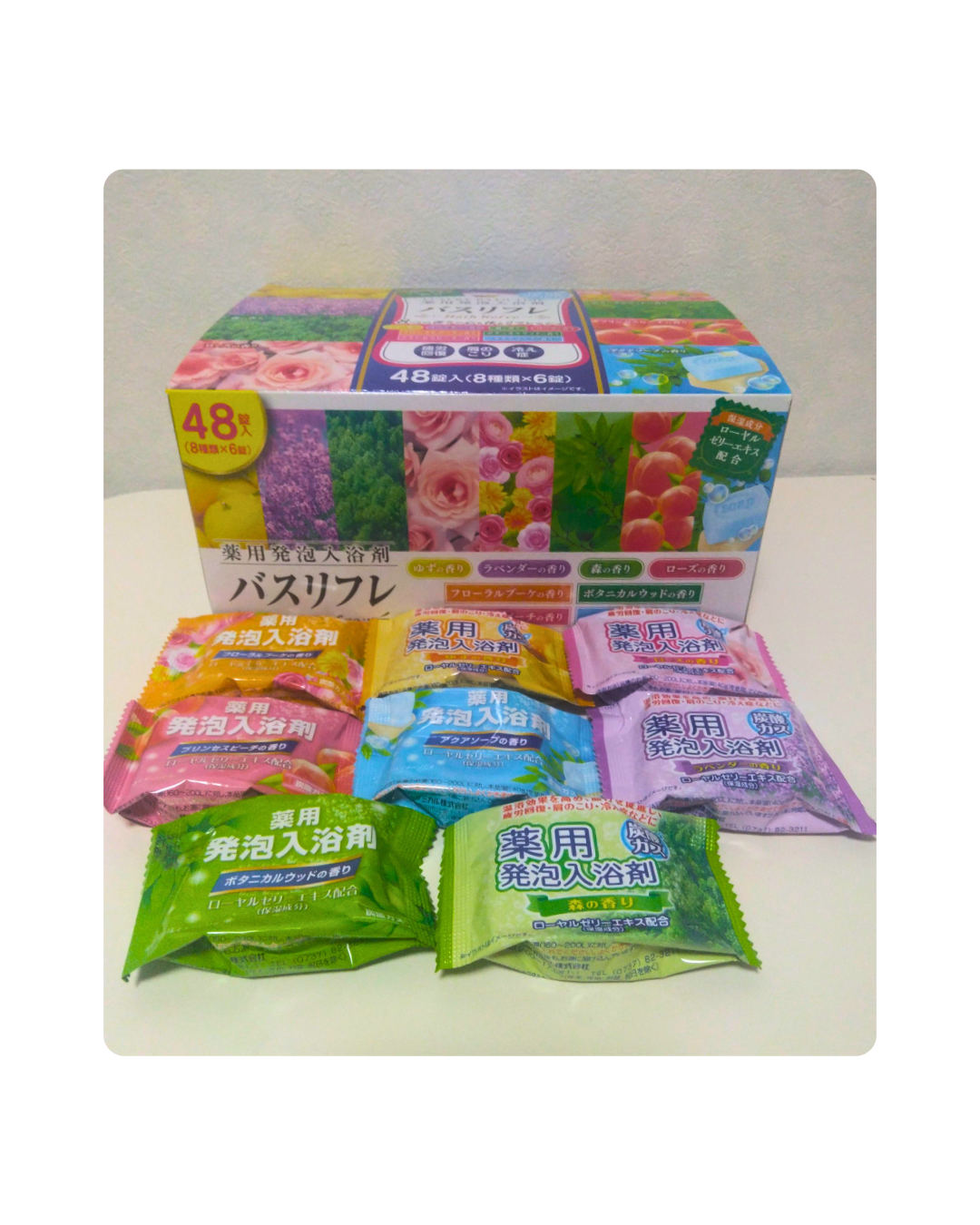 8種類×6錠入っていて、毎日選ぶのが楽しみになる入浴剤です。