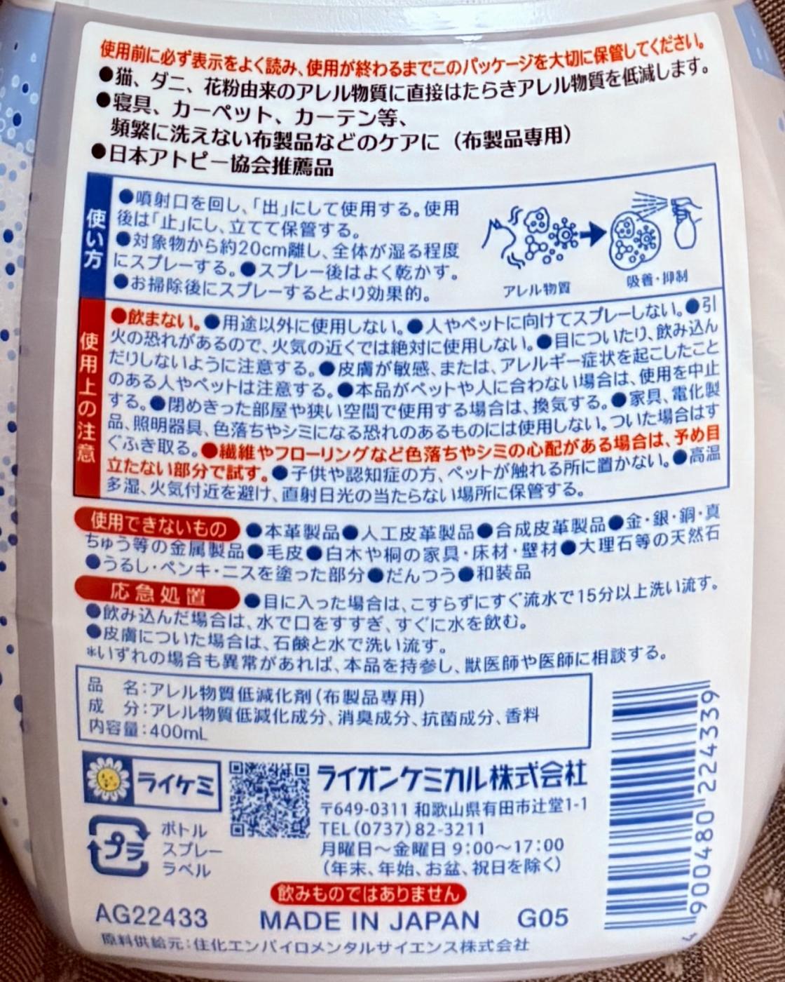シュシュッとスプレーするだけで、布製品についたアレル物質を吸着・低減してくれます。