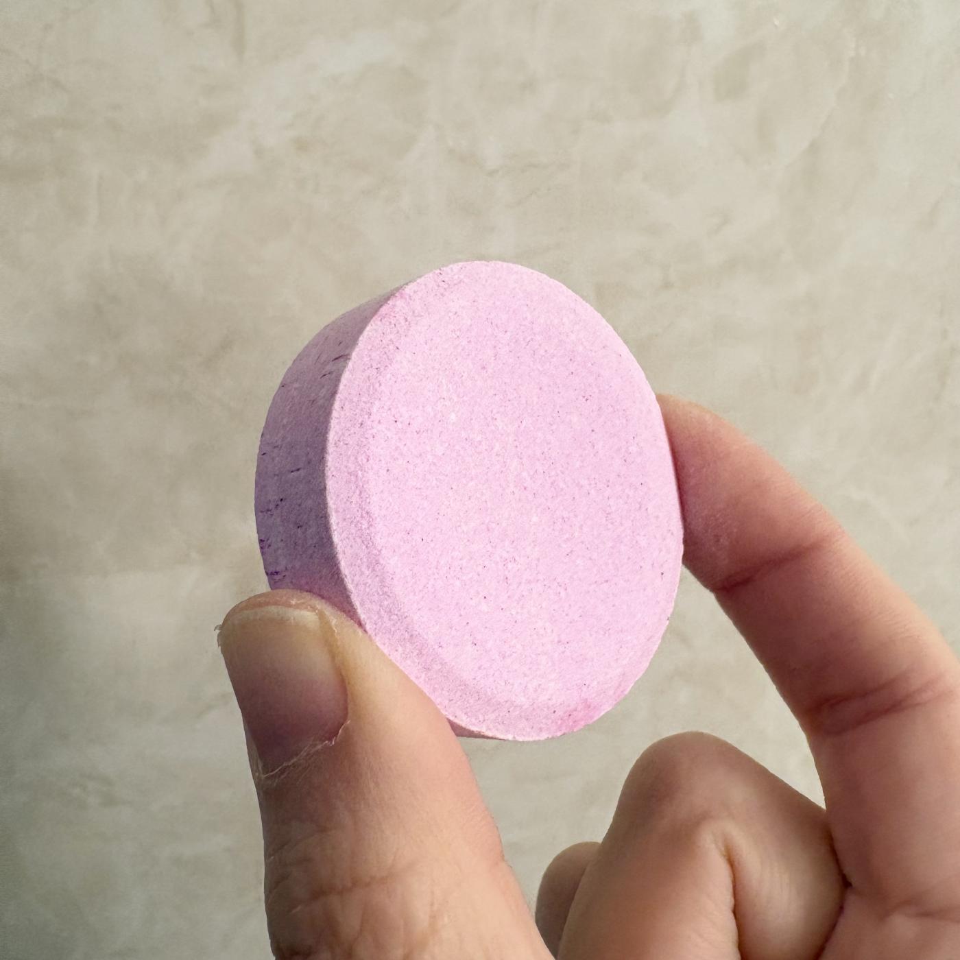 丸い入浴剤をポチャっとお風呂に入れると、炭酸の泡がしゅわしゅわ広がりながら溶けていきます。お湯がほんのり色づくのも、いい👍