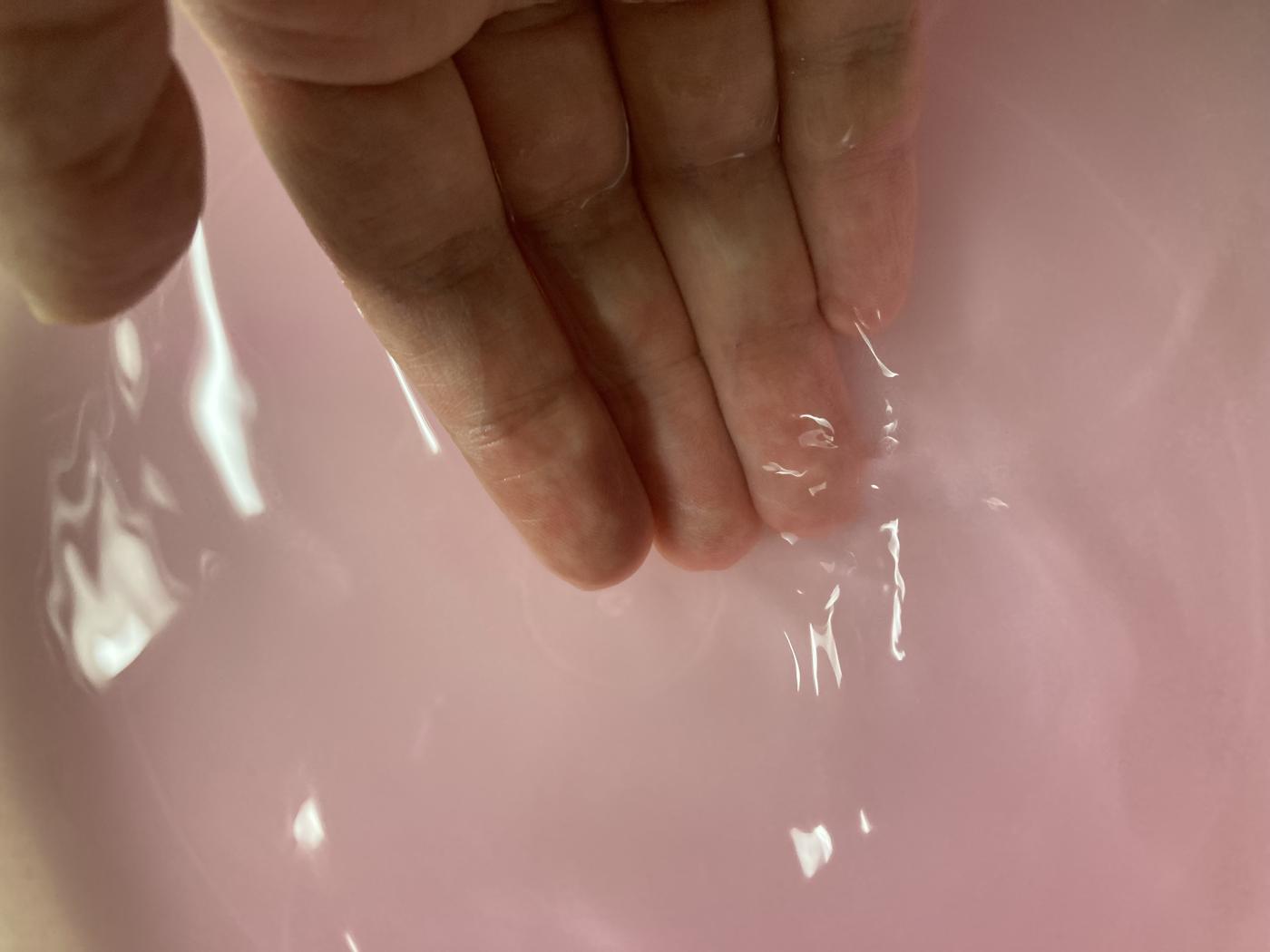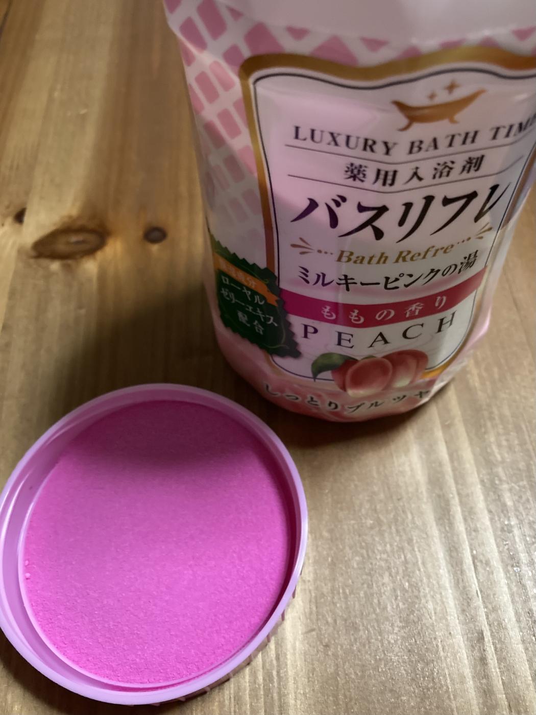 お湯に入れた瞬間に広がるやさしいももの香りは、甘すぎず、ふんわりとした香り方で、リラックスしたい日のバスタイムにぴったりだと感じました。お湯の色もミルキーピンクに変わり、見た目からも癒される空間になるのが印象的です。