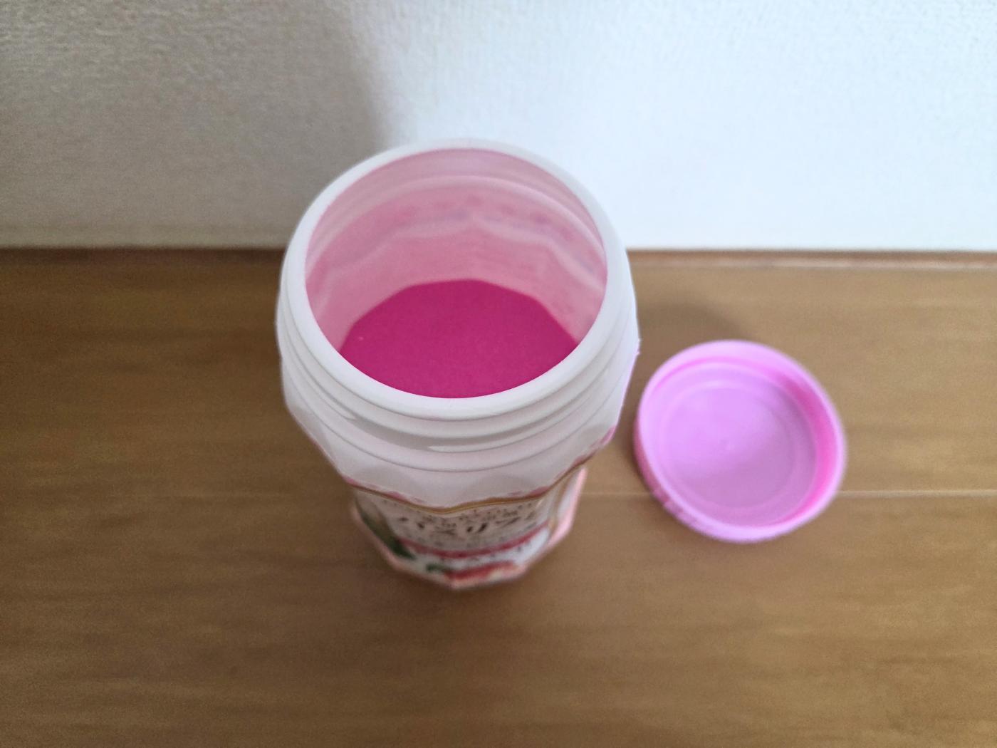 粉末はとても濃い色ですが、お湯に溶かすとミルキーピンクの優しい色に染まりました。