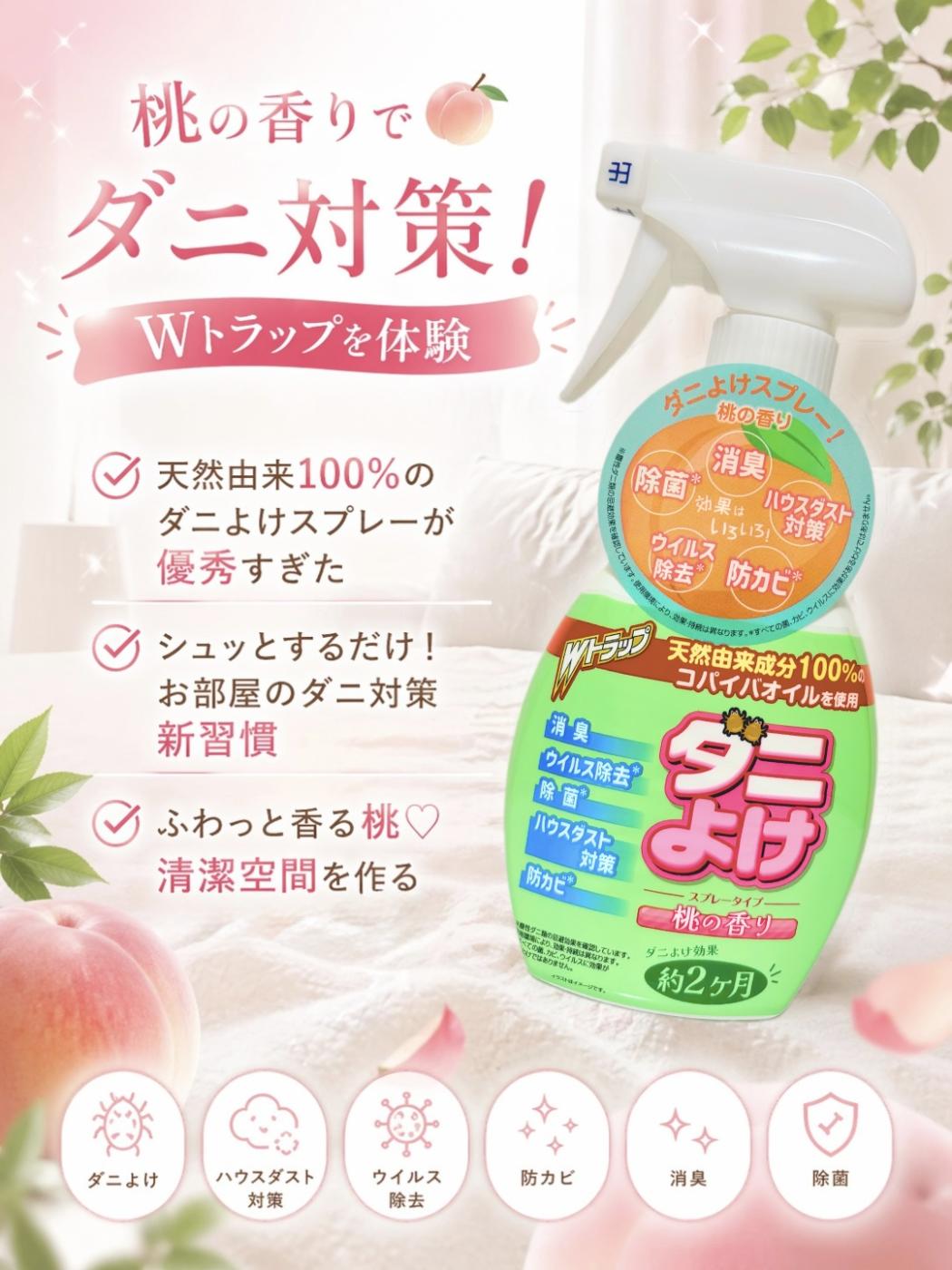今回お試しした『Wトラップ ダニよけ スプレータイプ 桃の香り』は、なんとこれ1本で以下の効果が期待できる多機能アイテムなんです!✨