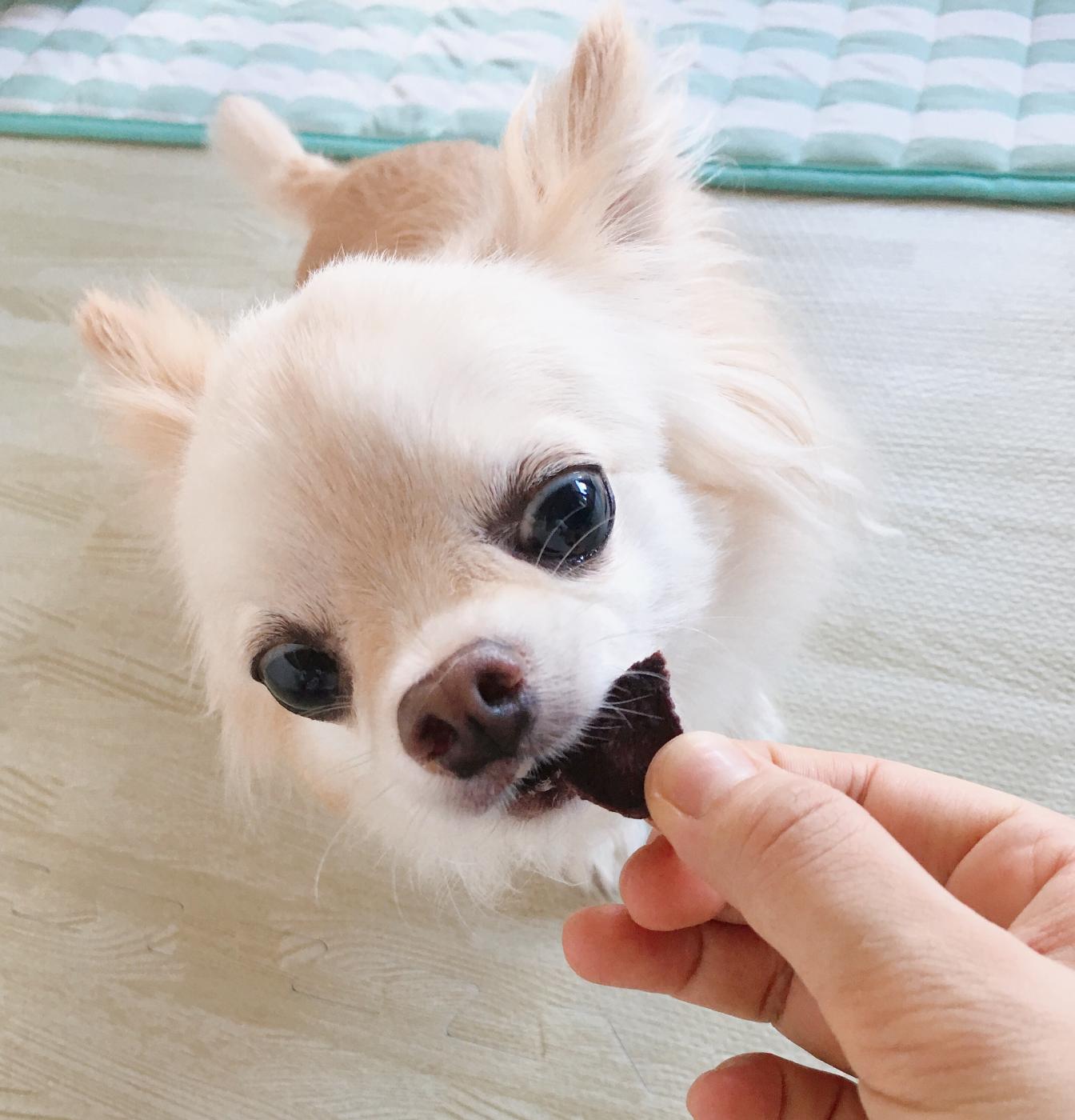 うちの子はあまり噛まずに丸飲みしちゃうタイプなので、ジャーキーはしっかり手で持ちながら、あげています。