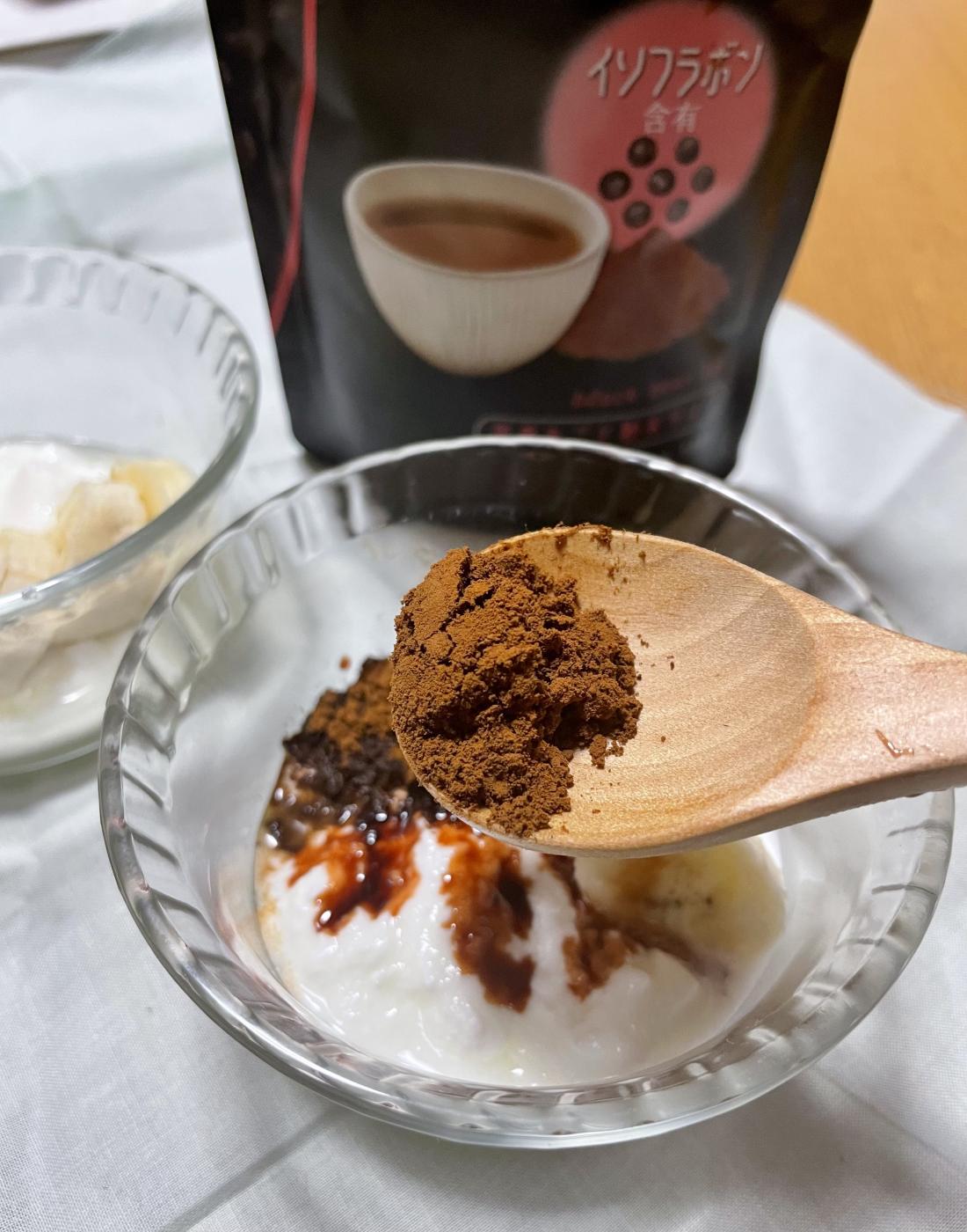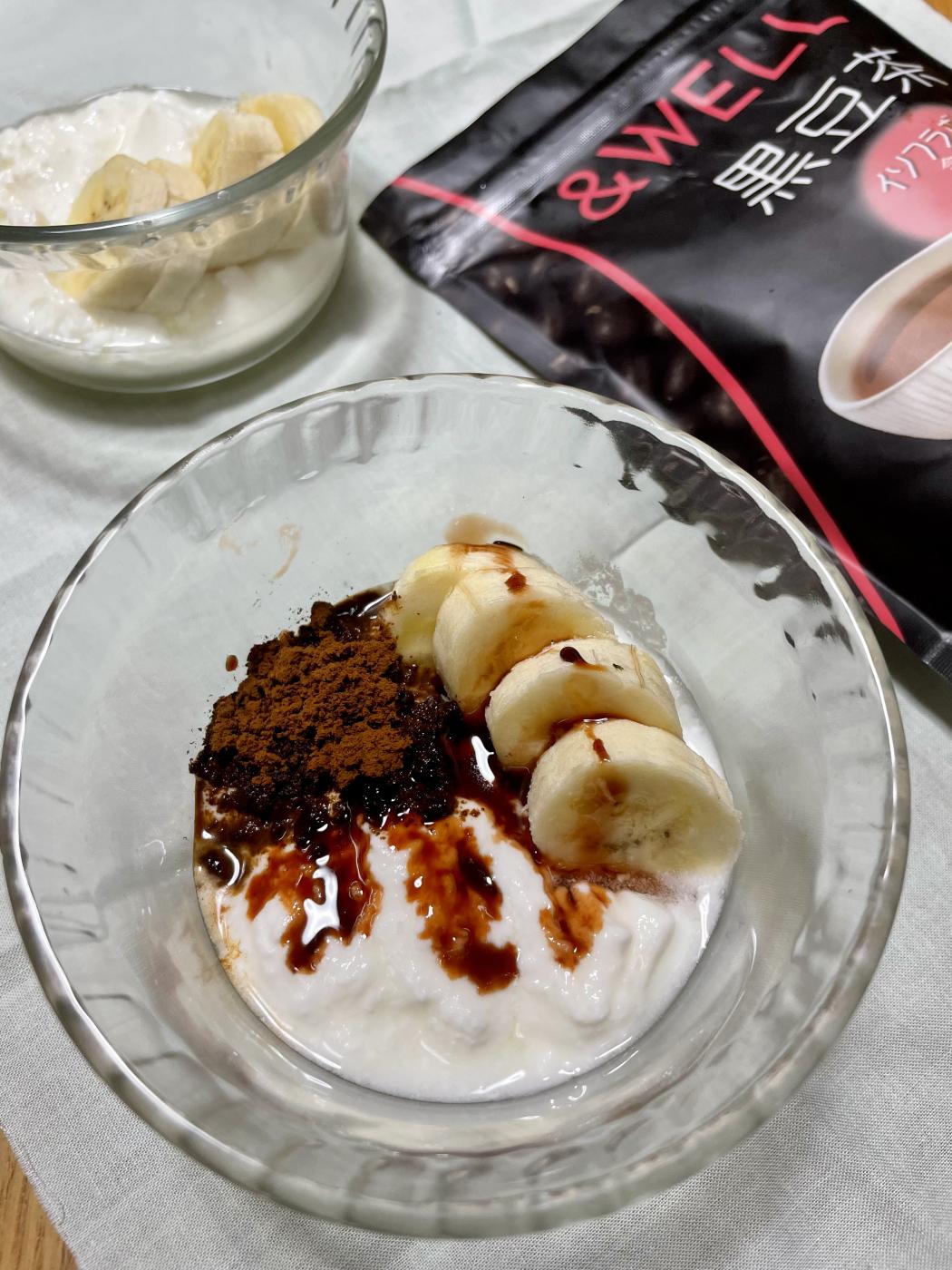 ヨーグルトに黒豆茶をかけて、バナナをトッピング。