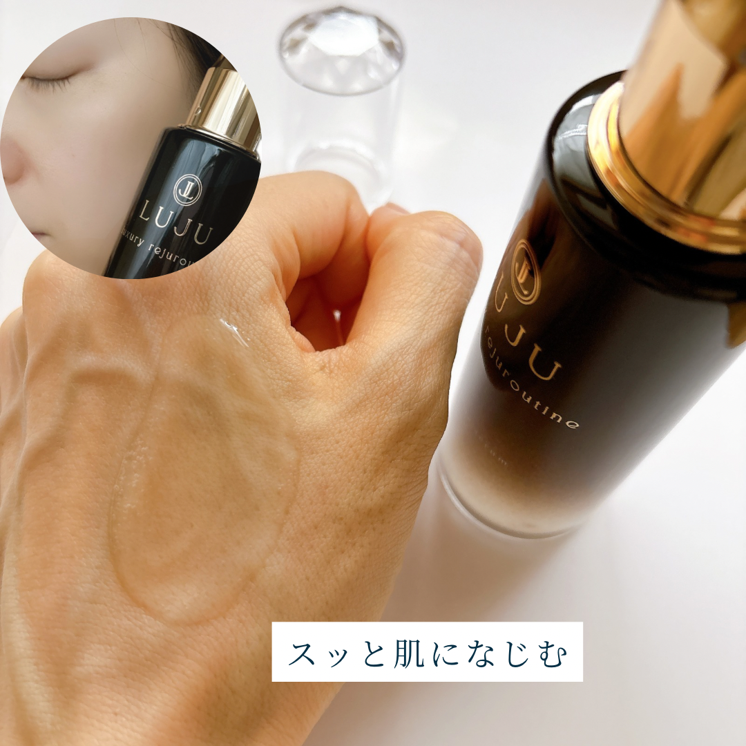 セラムのテクスチャーは ボトルから出すと、少しとろみのある感触です。肌にのせると、なめらかに伸び広がり、スッと肌になじんでいく。