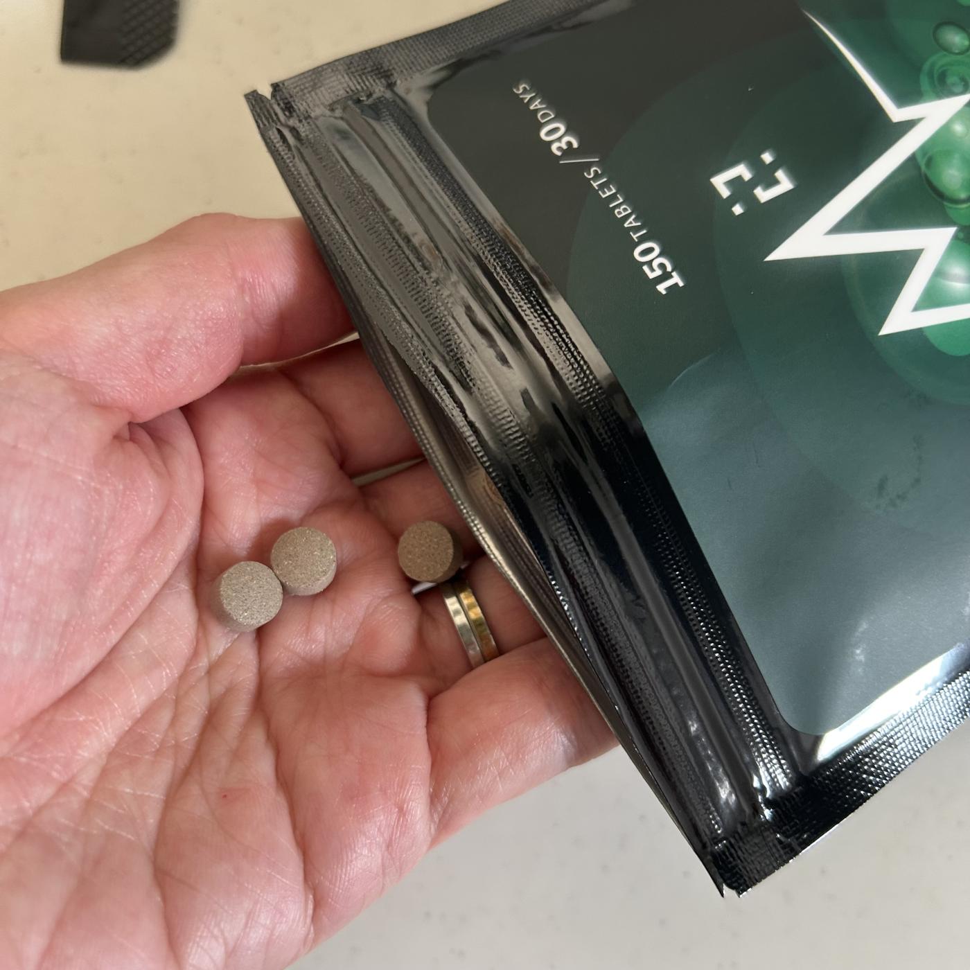 小さめの錠剤を一日に5粒、これ一袋で1ヶ月分です。