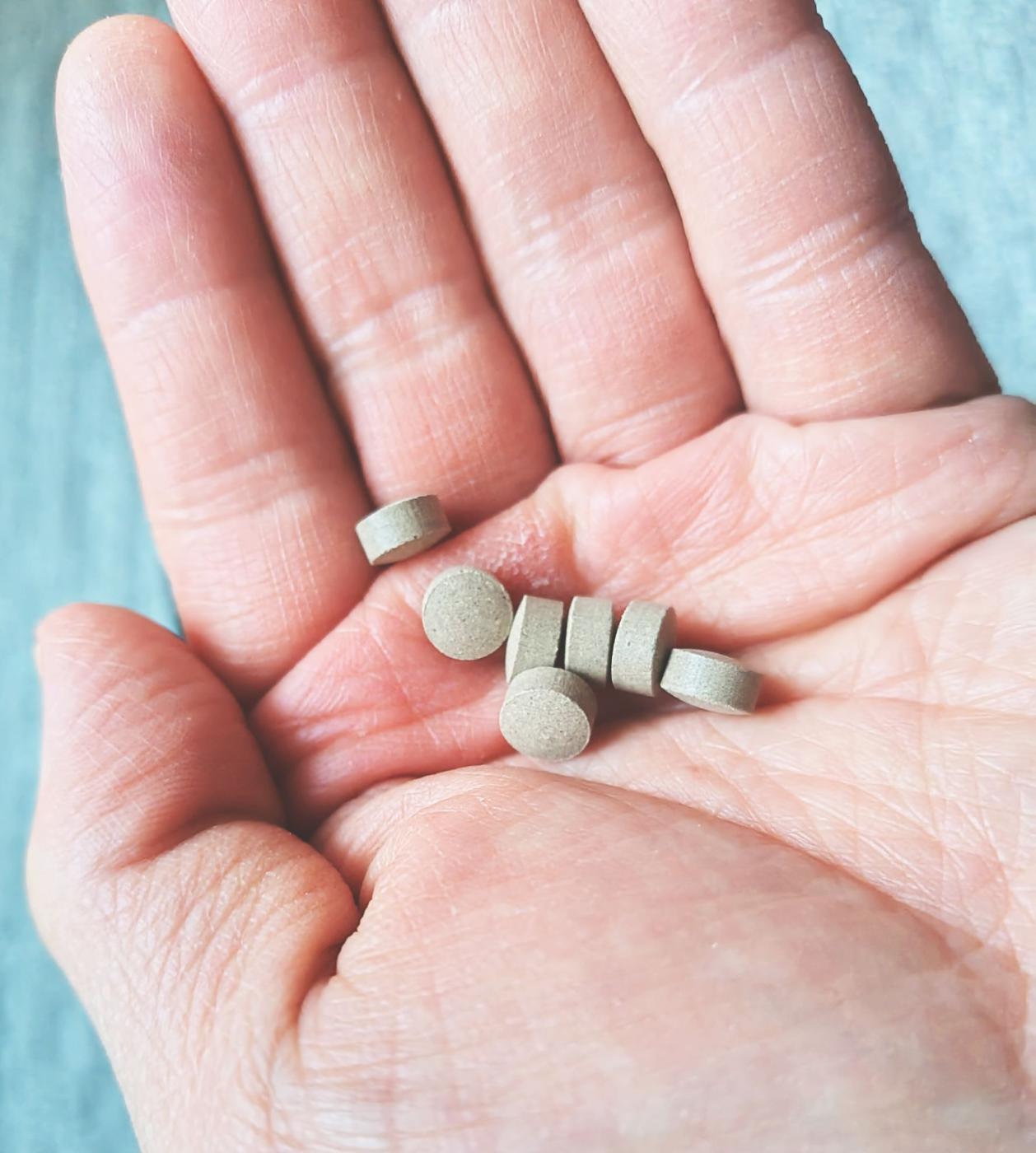 錠剤ですが粒は大き過ぎず、袋の中には多少臭いがありますが飲みこむのに支障はないので、まとめて5粒ずつ毎日飲んでます。意識的に多めの水で飲んで整腸にも期待したいところです。