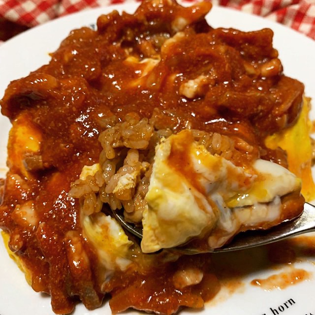 玉ねぎの甘みや豚の旨味が超~絶妙な味わいなんだけど、ケチャップの優しい味わいに素朴さがあり懐かしさも感じます。