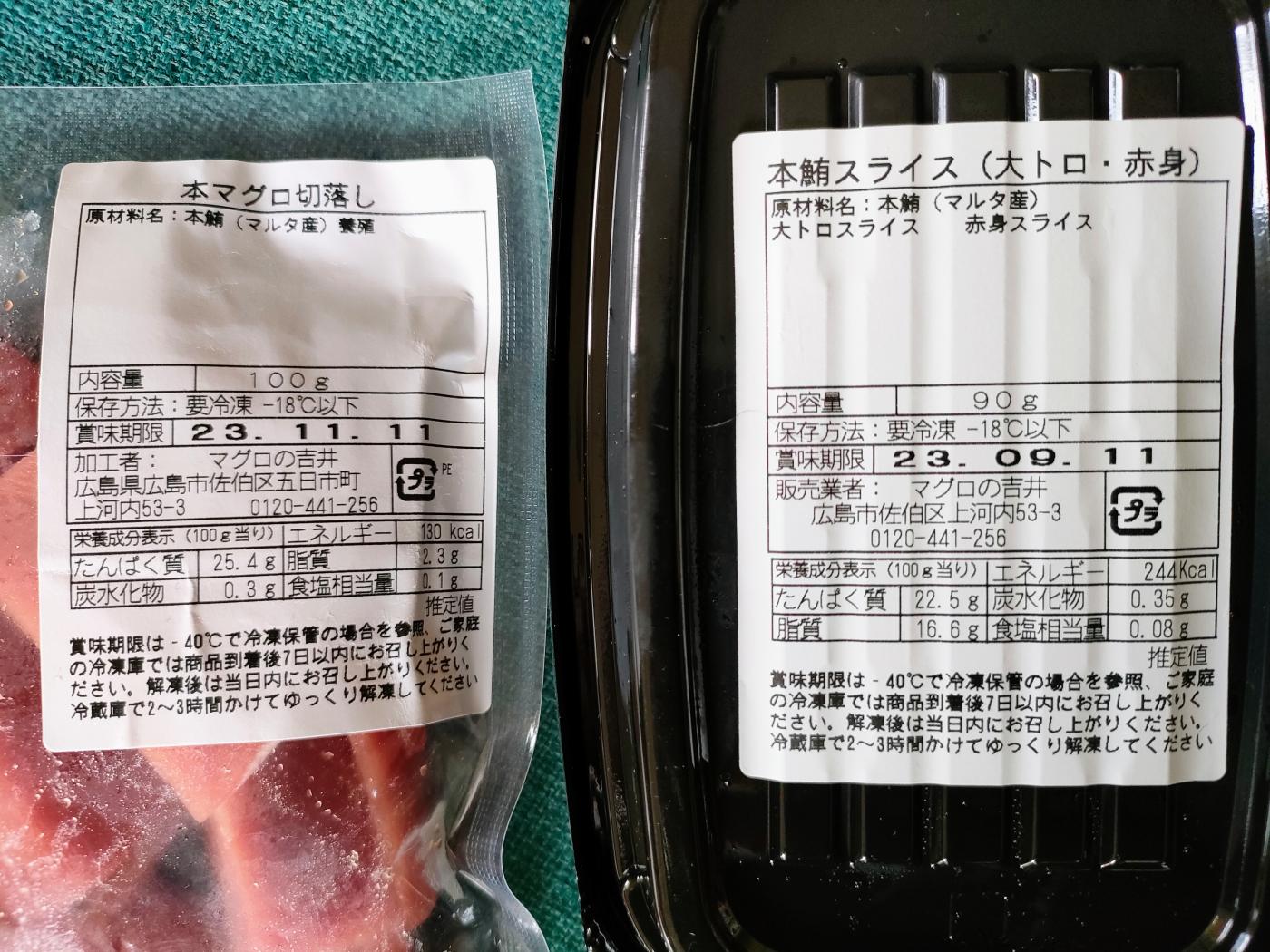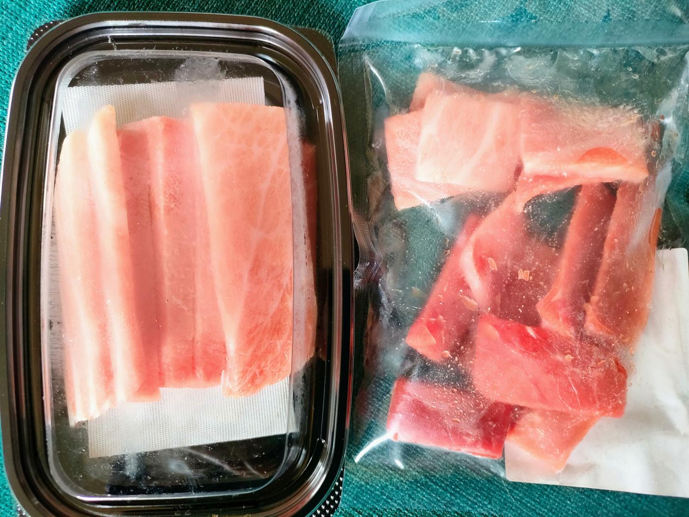 ・本鮪大トロ、本鮪中トロ、赤身が入った本鮪切り落とし 100g