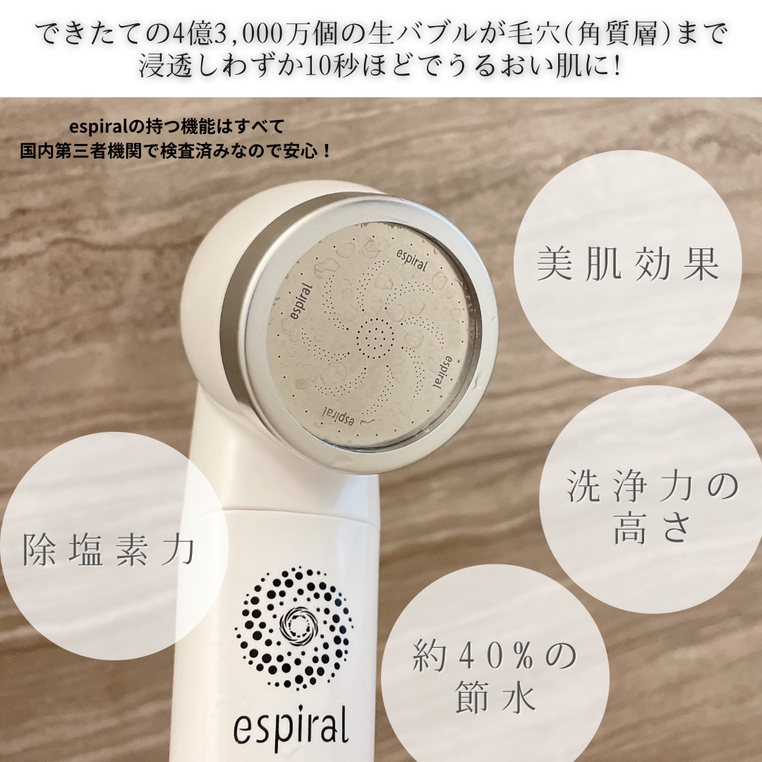 純日本製のシャワーヘッドのespiral✨ 4億3000万個のナノバブル発生させているそうで、生バブルをおうち...
