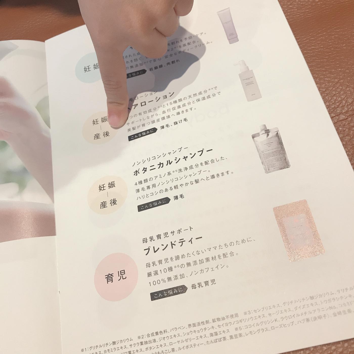 パンフレットを見ると、ヘアトリートメントセラムだけでなく、妊娠線ケアのボディクリームや母乳育児サポートのブレンドティーなど、今の私にピッタリなラインナップでどれも魅力的だなぁと思いました!