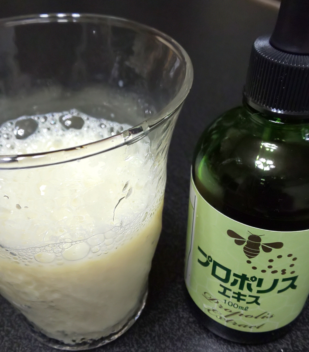 この時期になると夏の溜まっていた疲れが一気に出て、また台風や気圧の変化で偏頭痛や風邪を引いて寝込んだり必ずって言っていいくらい体調を崩す私。何か健康にいいものはないかなとさっそくプロポリスエキスを試してみました。スポイトが入っていて1mlを目安に水で薄めるだけ。ブラジル産の純正グリーンプロポリスでかなり期待できそう。エキスは茶色なのに、水で薄めると乳白色に変化。原液は匂いもきついけど、薄めると匂いは気にならず味も飲みやすいです。コップ半分くらいの量だからゴクッと飲み干せる。殺菌作用効果もあるプロポリスは頭皮の匂いが気になったらシャンプーのときに数滴混ぜたり、薄めてうがいするとオーラルケアにもなるらしい。さっそくいろいろ試してみよう。季節の変わり目の健康管理に毎日、飲み続けていこう。