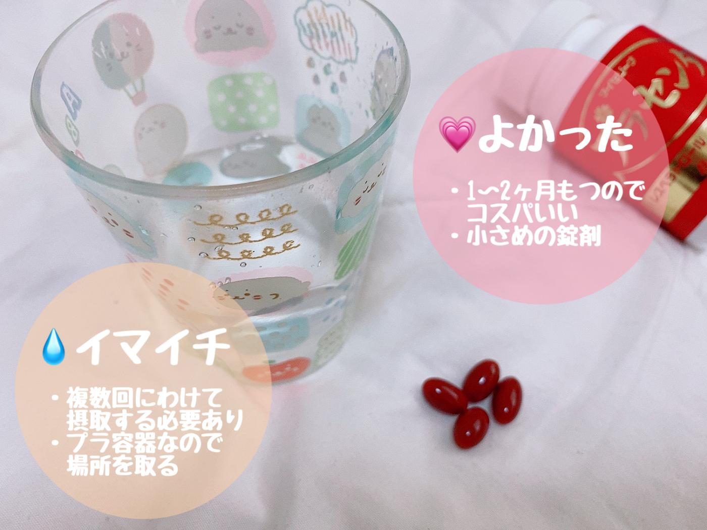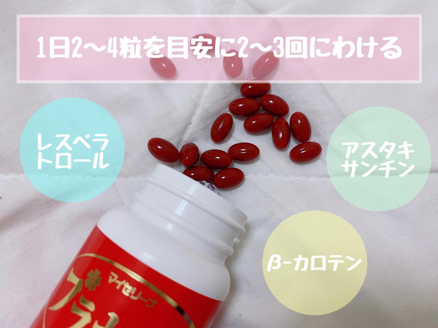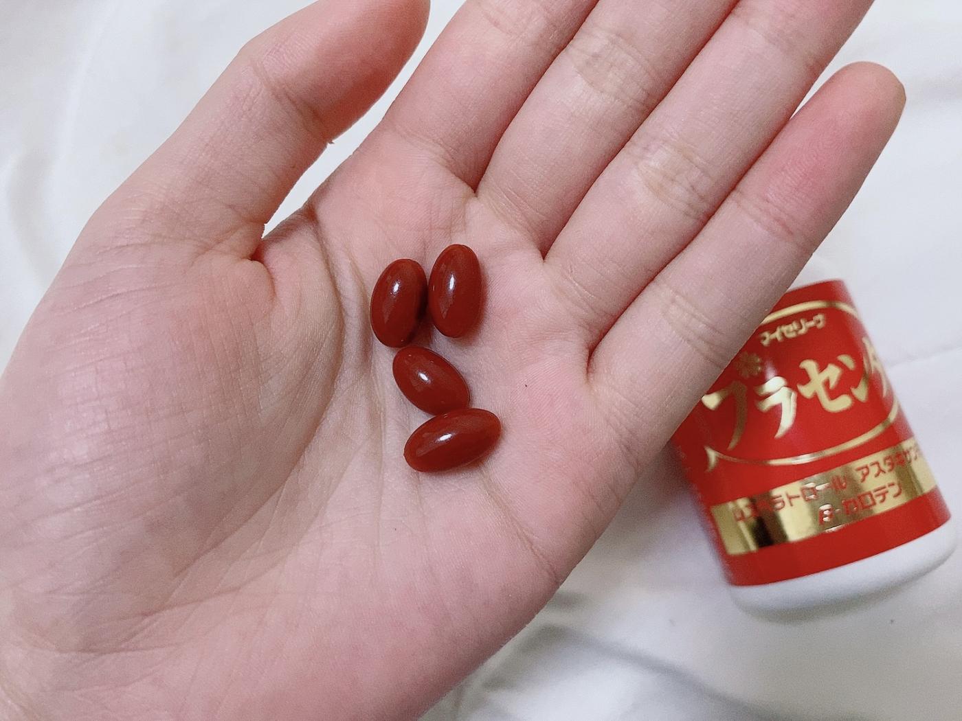 小さくて赤いサプリメントで、無味無臭です。だから、飲みやすい??1日2〜4粒を2〜3回にわけて飲むのを推奨しています。複数回にわけて飲まなくちゃいけないので、そこは面倒かなぁと思います?そう考えると、1日1粒のものって本当楽ですよね、、、?