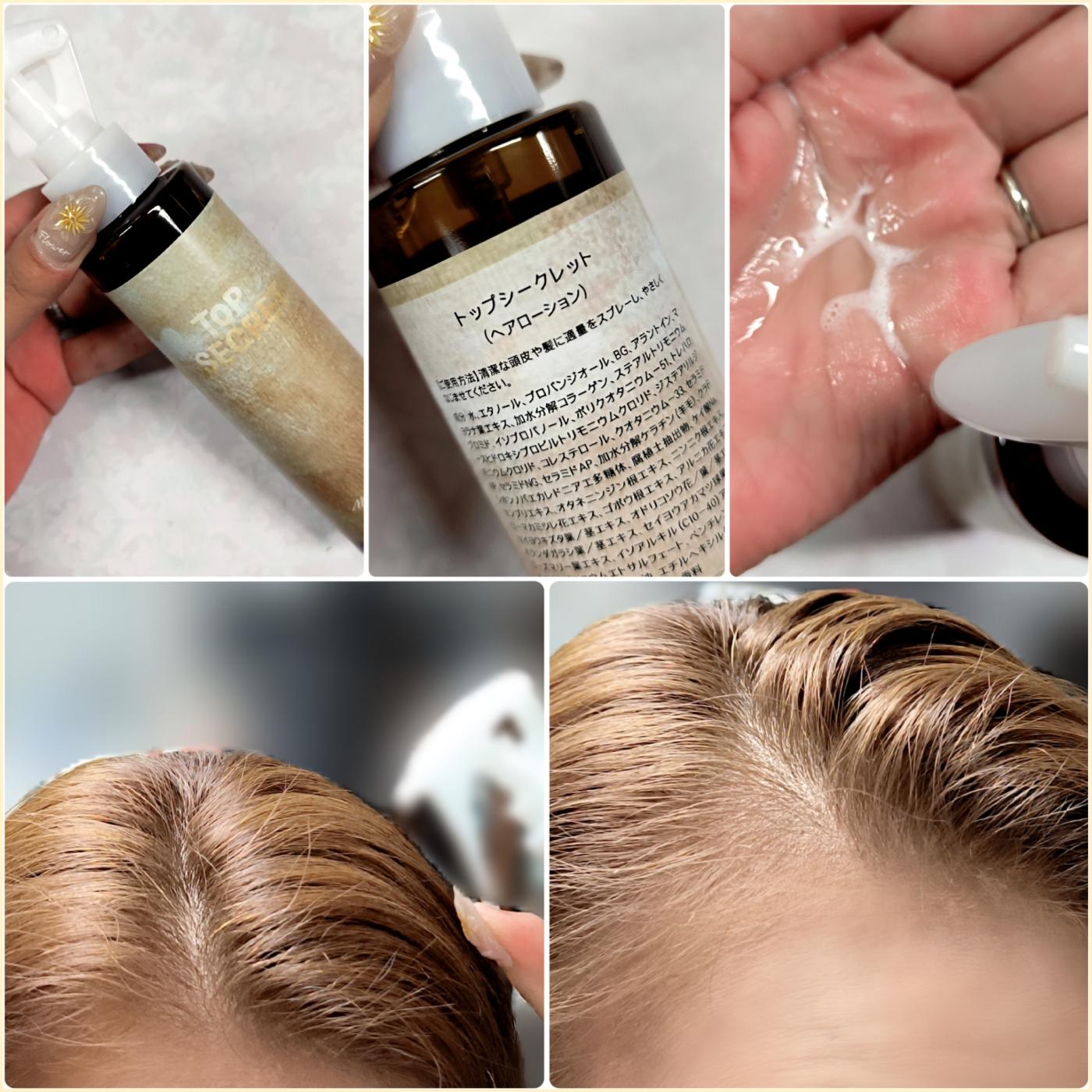 頭皮ローション トップシークレットと メイクメリーMシャンプーのお試しサイズの使用。