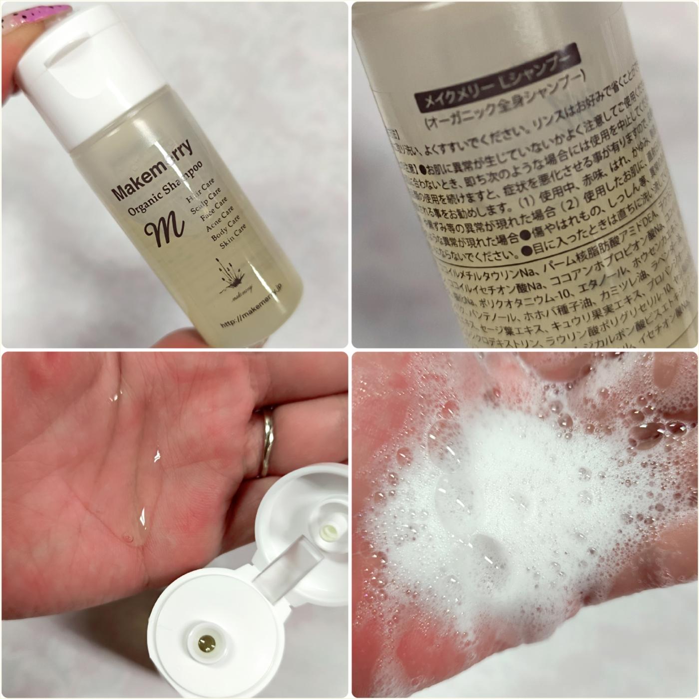 メイクメリーMシャンプーは、とろみのあるテクスチャーで泡立ちがいい。きしみも感じにくい使い心地。