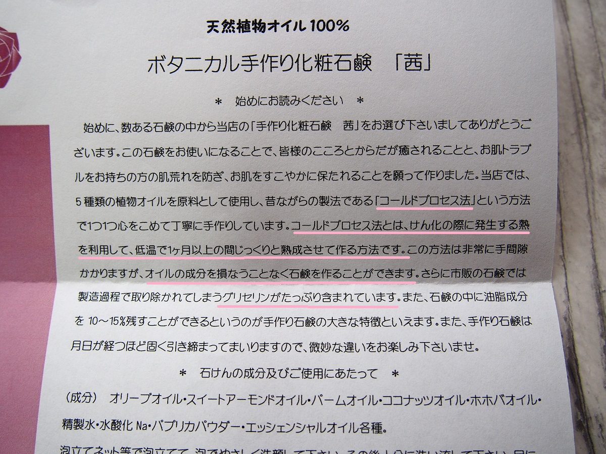 ボタニカルな手作り化粧石けんを作っていらっしゃる「茜」さんは普通肌・乾燥肌・脂性肌、そしてベビー用などの石けんを作っていらっしゃるようです。