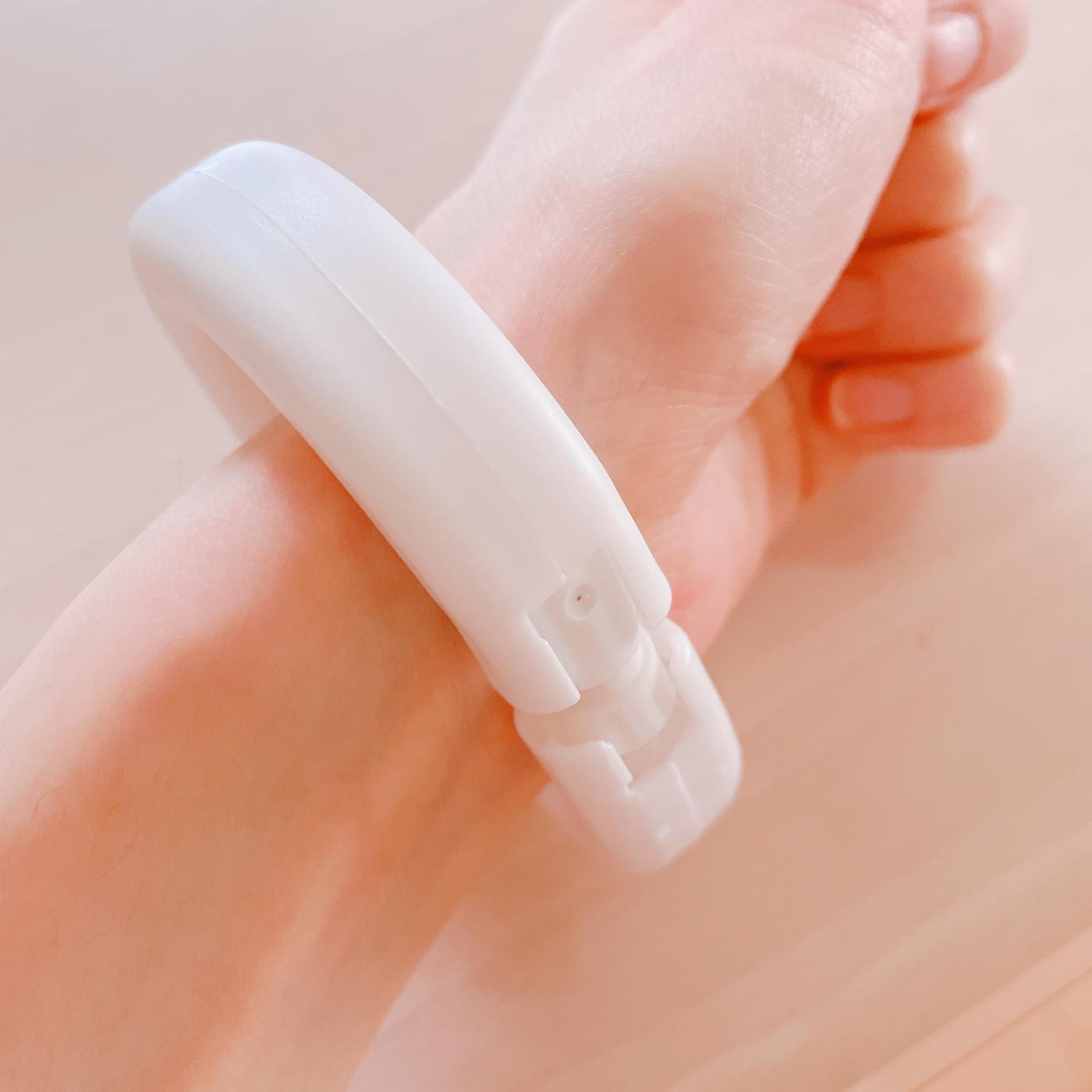 手首にブレスレットのようにはめて持ち歩く事ができる携帯型消毒スプレー。