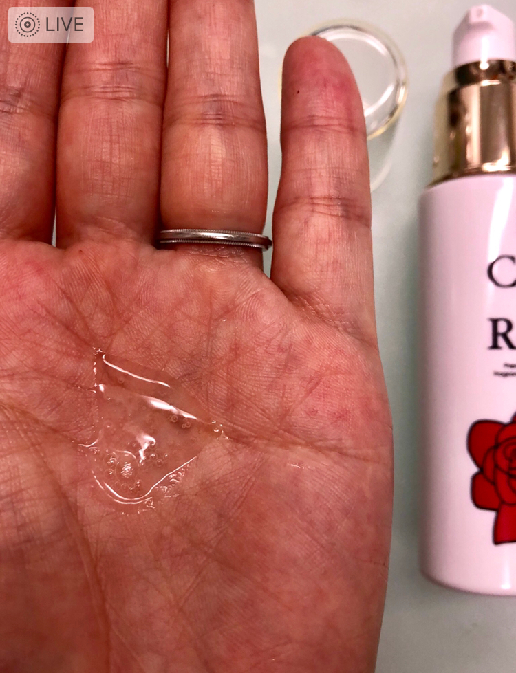 美容液は透明でテクスチャーはジェルを少しやわらかくしたような感じです。美容液をお肌になじませるとバラの濃厚な香りがふわーっと香ります。いい香りで少し高級感ある香りで癒されました。使うといい香りで、でもそこまできつくない香りで、自分が女性であるという実感がわく、そんな美容液だなと感じました。ベタつきもないので使いやすいです。