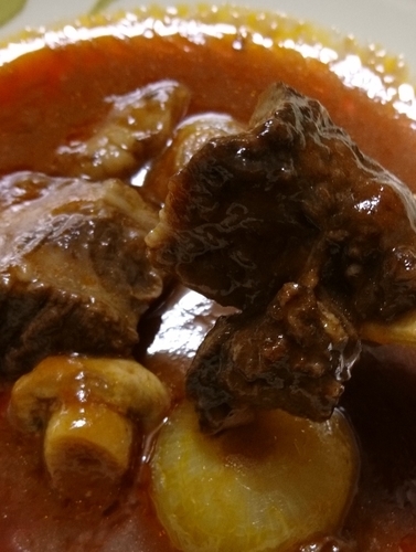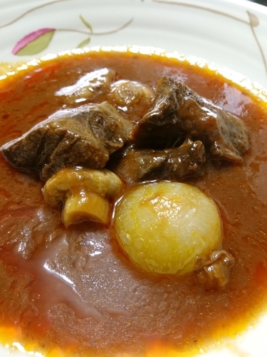 牛肉は大きな塊が2つ、玉ねぎとマッシュルームが入っています。