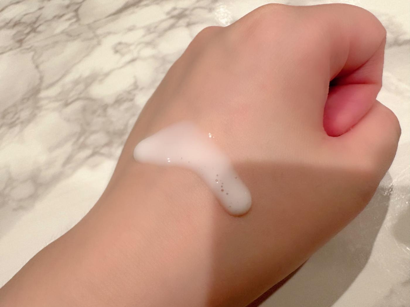 肝心の使い心地ですが、乳液っぽい乳白色のトロっとしたテクスチャで、肌にスーっと馴染みます。