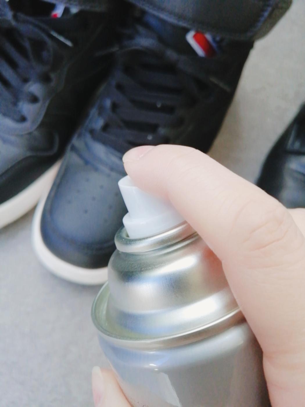 シューっと靴に向けてスニーカー用撥水撥油スプレーをする・・・