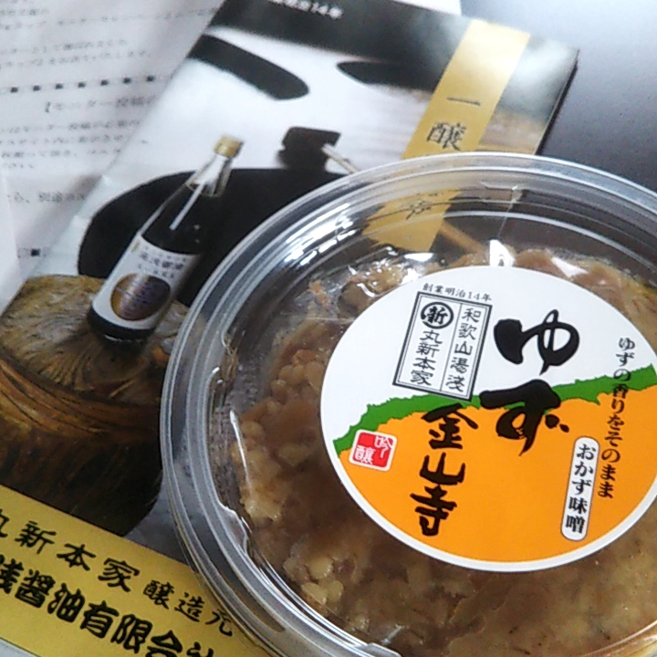 丸新本家の金山寺ゆず味噌、さっそくご飯にのせて食べたり、釜揚げしらすと一緒に食べたりいろいろ試してます。なすや瓜、ゆずの皮も入っていてかなり美味しくいただいてます。ゆず味噌の他に梅金山寺、ニンニク金山寺、わかめ金山寺、オリーブ金山寺と種類も豊富でお味噌のほかにも醤油やポン酢、塩麹、大豆手作り石鹸まであるみたいでいろいろ試してみたくなりました。麻婆豆腐に隠し味で入れてもコクが出て美味しいです。多分にんにく味噌が一番合うような気がします。カタログには、金山寺みその作り方や醤油、甘酒の作り方まで載っているので見てるだけで興味がわいてきます。醤油の手作りキットも売ってるみたいなのでチャレンジしてみたいと思います。ありがとうございました。