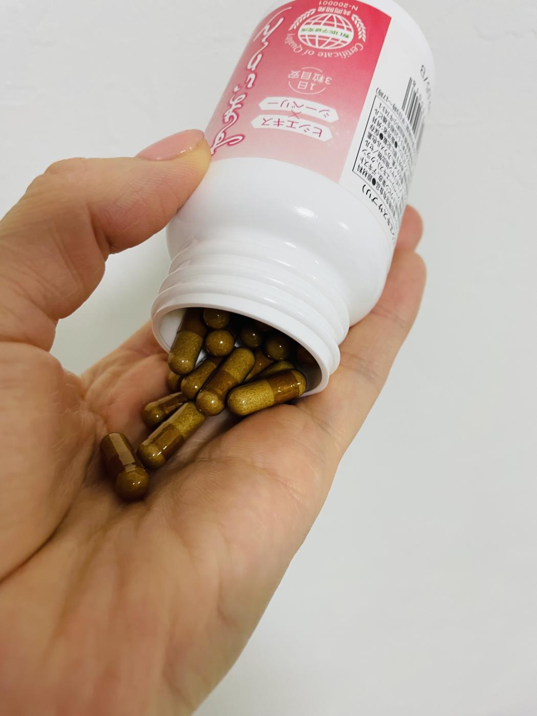 開けてみるとつるっとしたカプセルが入っています。大きさは私の場合、人差し指の第一関節くらいかなと感じました。細身のカプセルなので長さほど大きいとは感じません。飲んでみたところ、表面がつるっとしているので楽に飲み込めました。成分はカプセル内なので匂いも感じません。一日3粒も苦にならないと感じました。