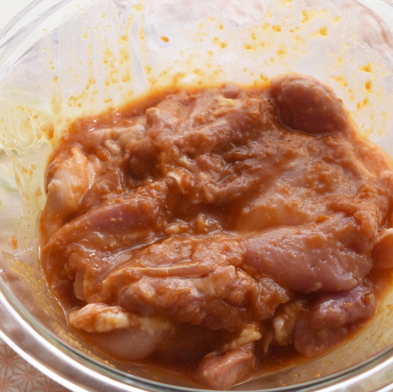 鶏もも肉2枚に対し、まるゆき味噌大さじ2、酒・砂糖・みりん大さじ1、はちみつ大さじ1を混ぜ合わせたものに鶏肉を入れ、半日ほど冷蔵庫で漬け込みます。