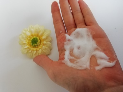 手のひらにだして、まぜあわせると、炭酸の細かい泡がでてきて、すぐに白くなっていきます。