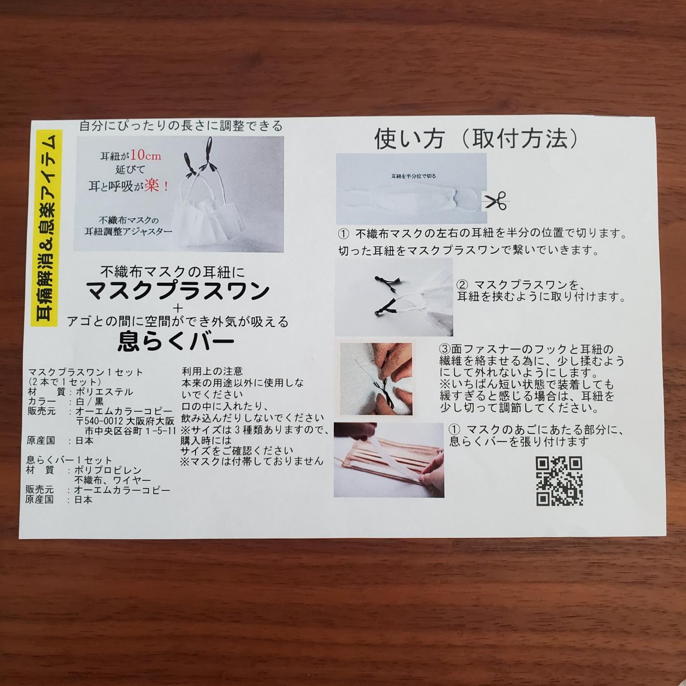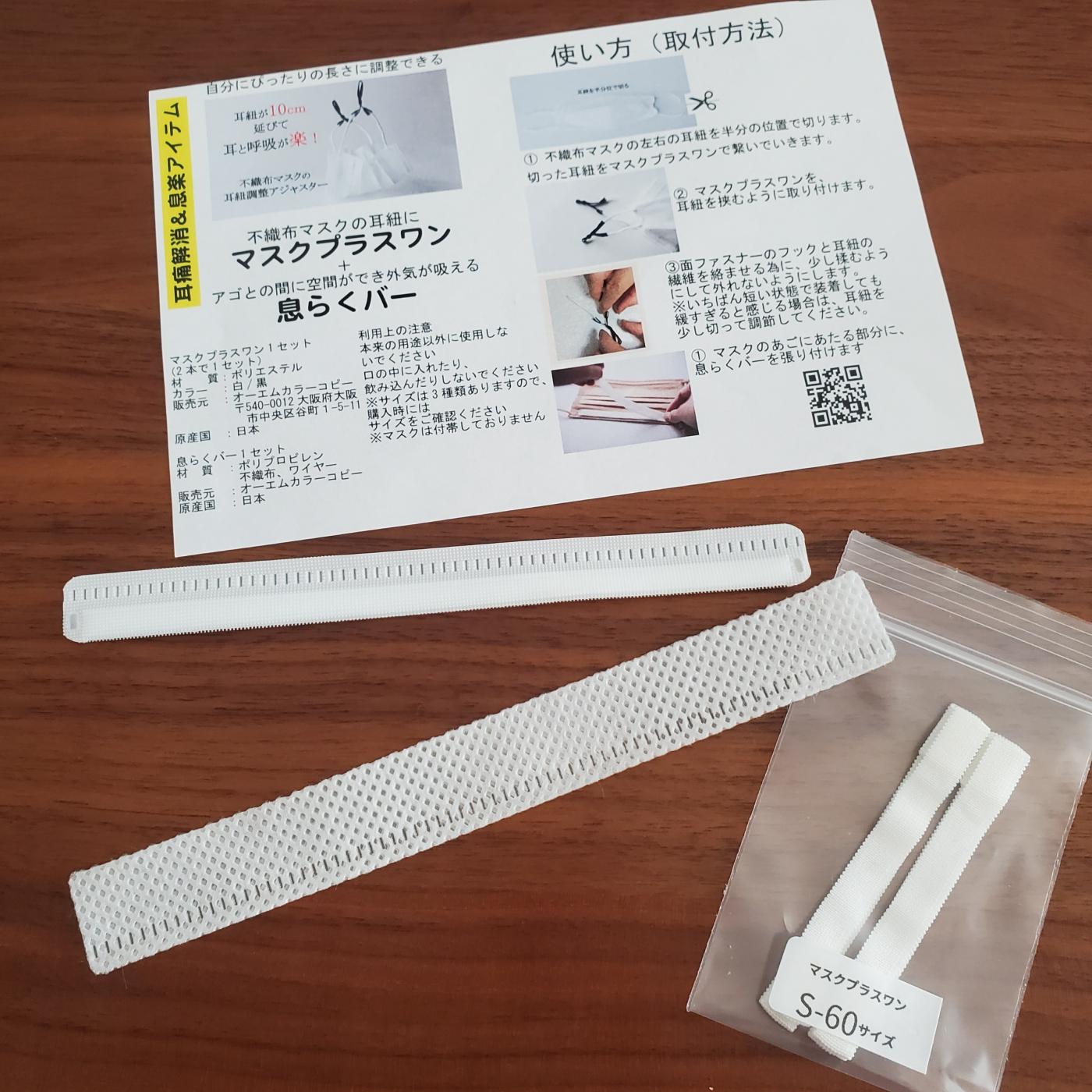 息らくばーという形状記憶ワイヤーもセットになっていて、不織布マスクの下の内側に湾曲させ貼るとマスクとあごの間に空間を確保し息がしやすくなるアイテムです!