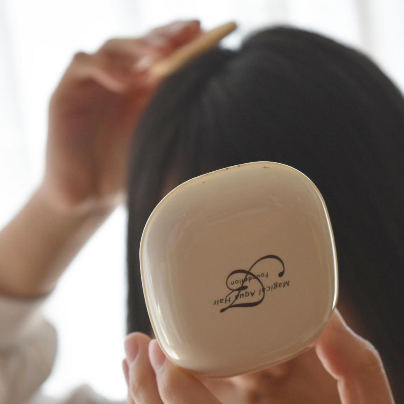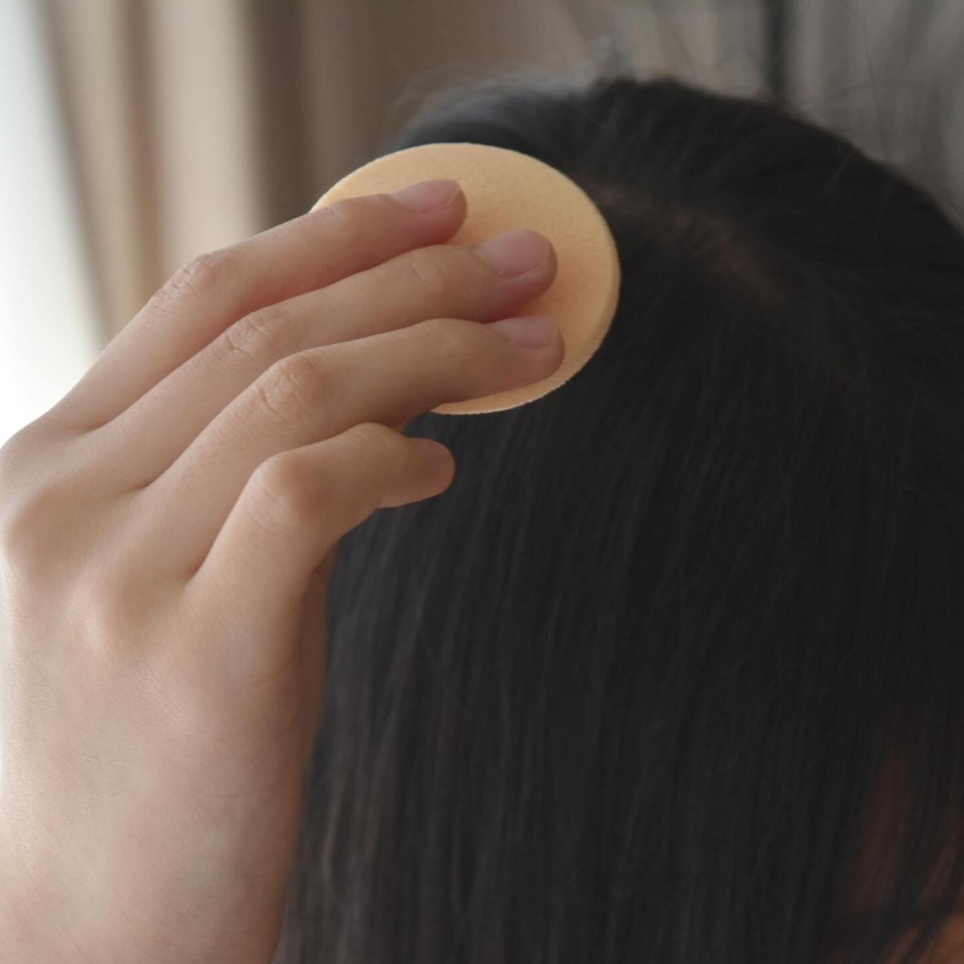 こちらは、パフに黒色のファンデーションをつけて髪の毛に塗るだけで、簡単そして手軽に白髪隠しができるアイテムなんです。