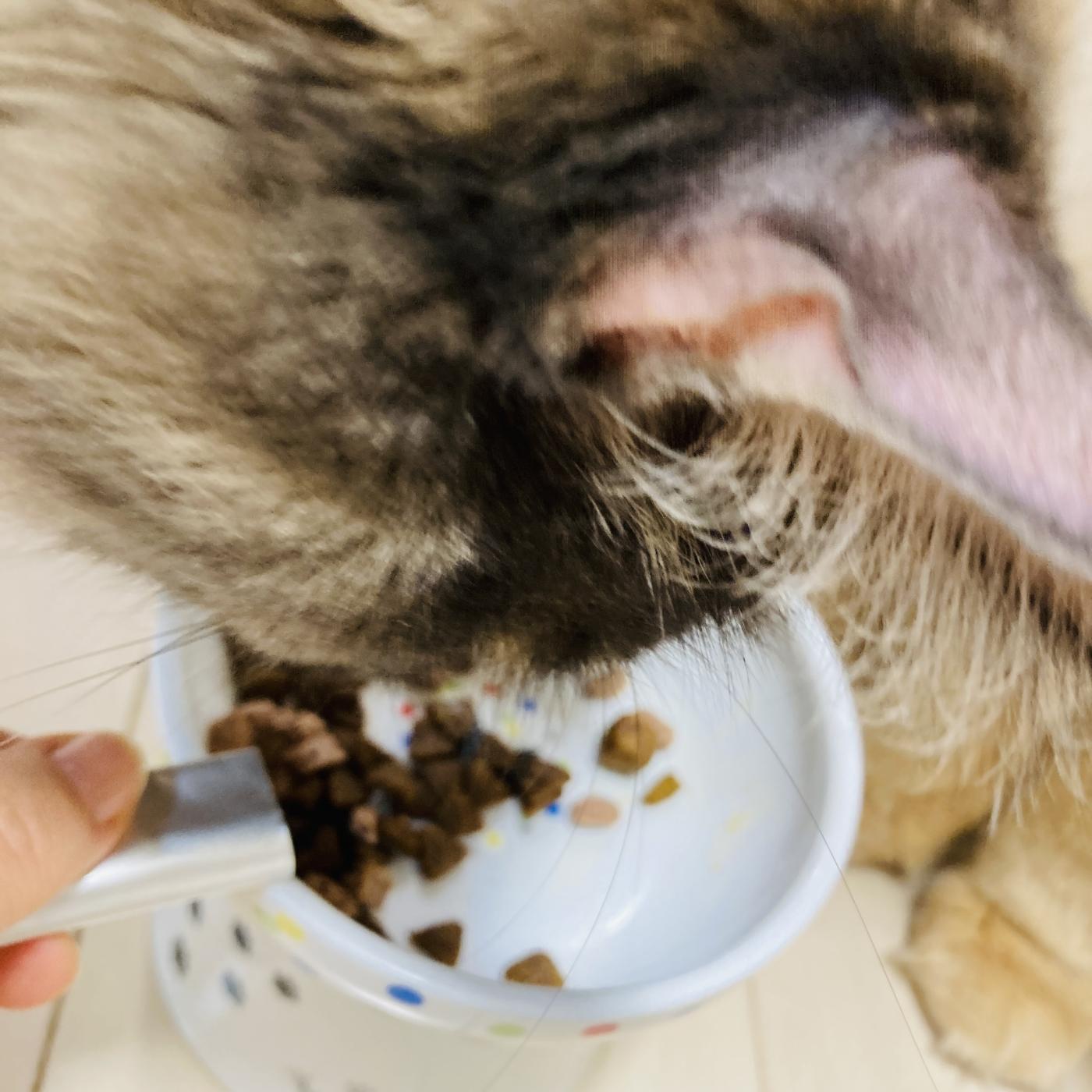 これ、なかなかに食いつきが良くて驚きました。カリカリにかけたりウェットにかけるとよく食べてくれますね。さらに猫が好む匂いなようでして、我が家の猫がたくさん寄ってくるほどでした。食い気味になっていて、上手く撮影できないくらいに大人気でしたよ。