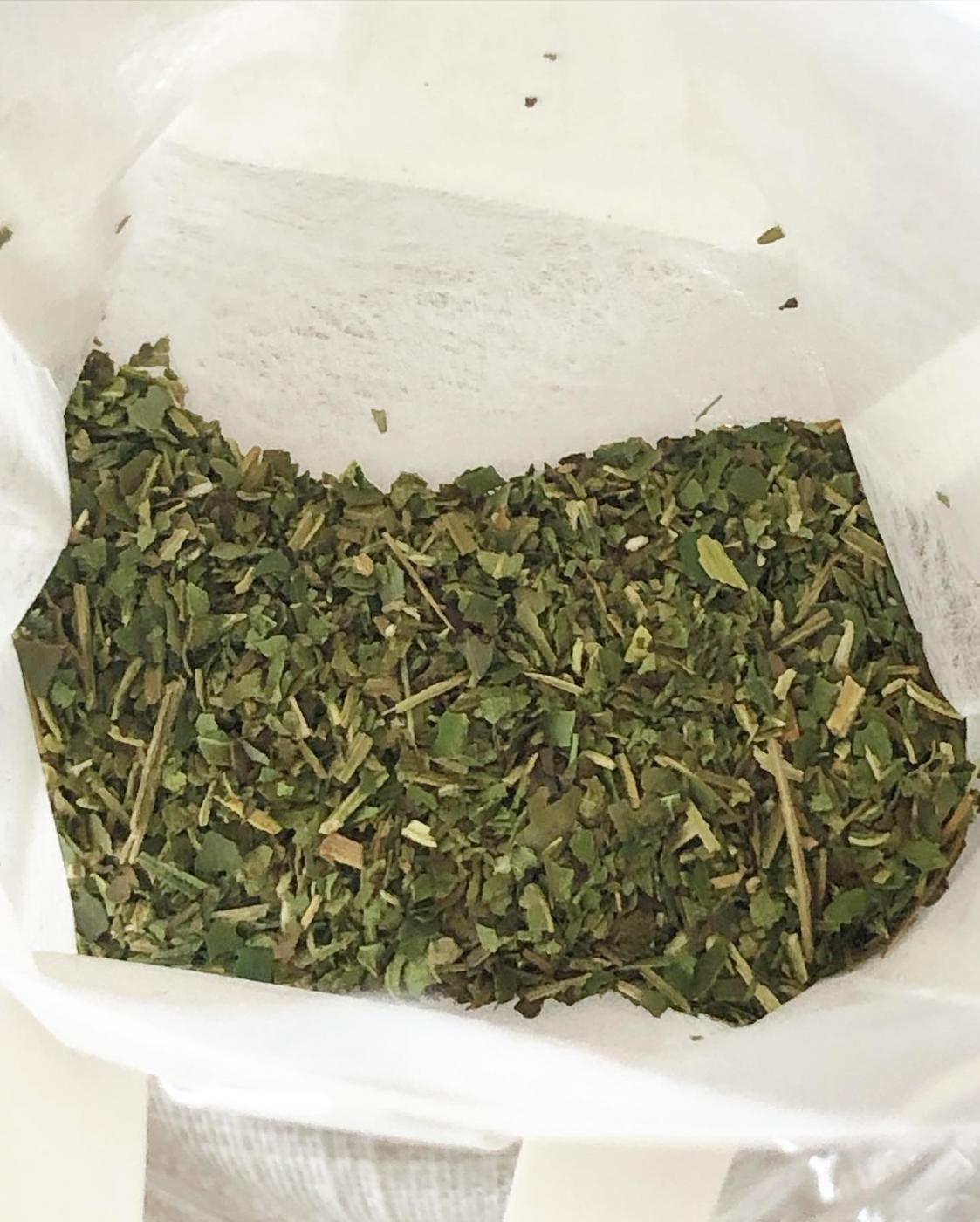 ドリップバッグ開けて中身を見てみると、野草のニオイがふんわり香るよ。細かくなったら緑色の茶葉と言うよりは…葉っぱかな。