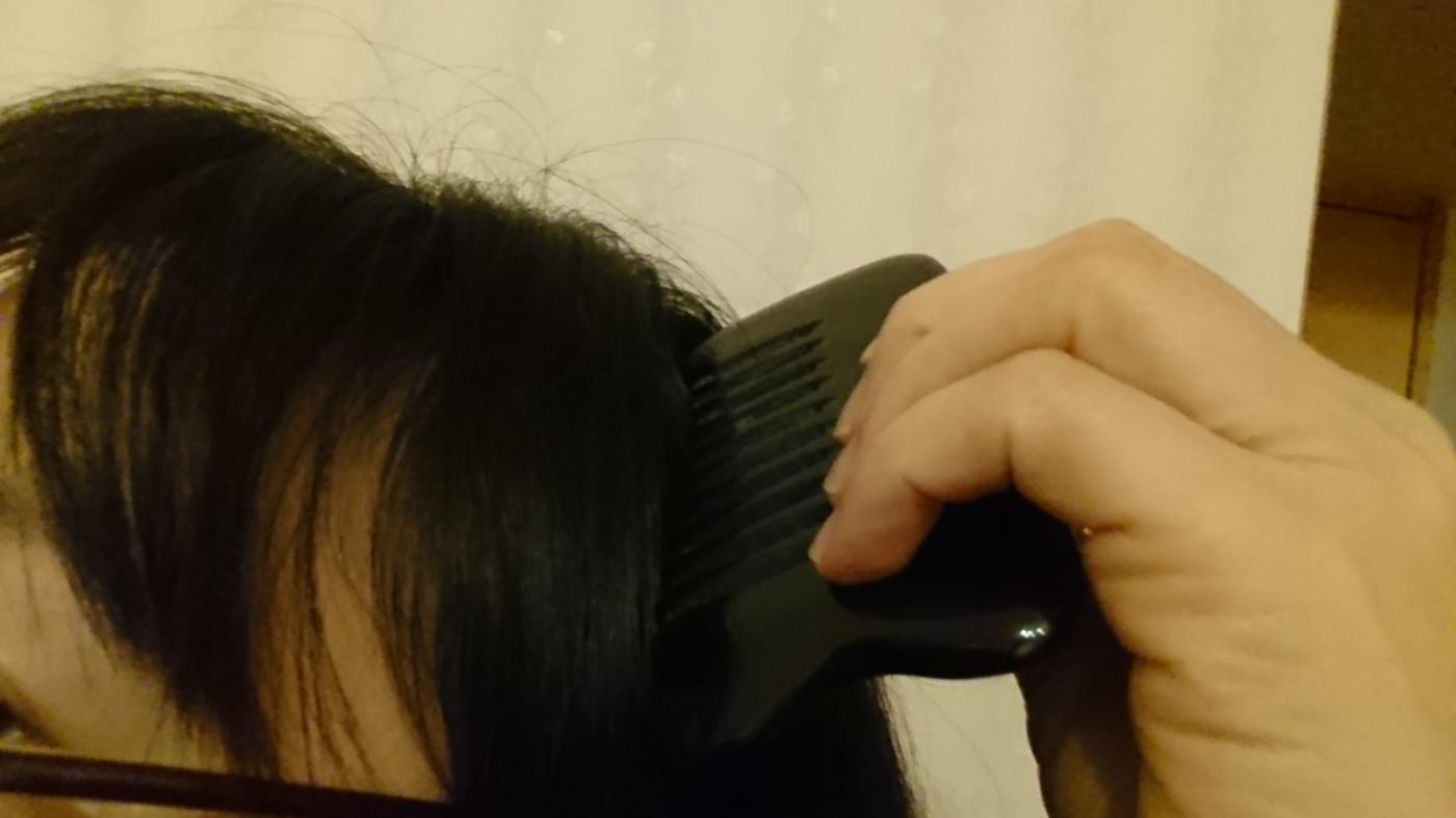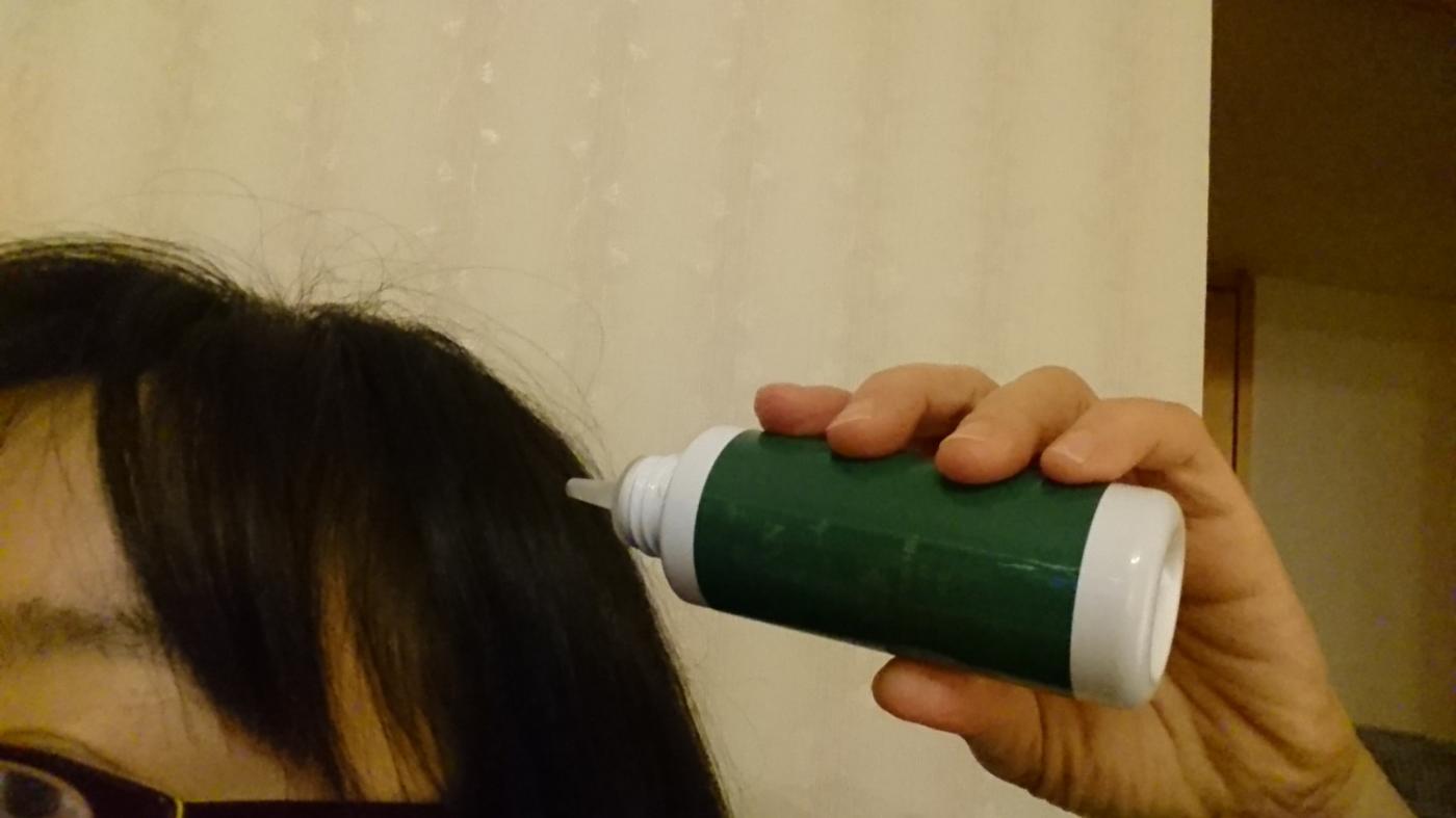 薬用育毛剤メリディアンを頭皮に塗り込み、育毛かっさで頭皮をマッサージします。