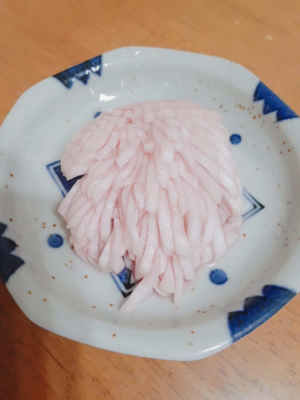 ハイビスカスローゼルすし酢は綺麗なピンク色になるためカブの酢の物では、ほんのりピンク色になり綺麗なカブになりました。