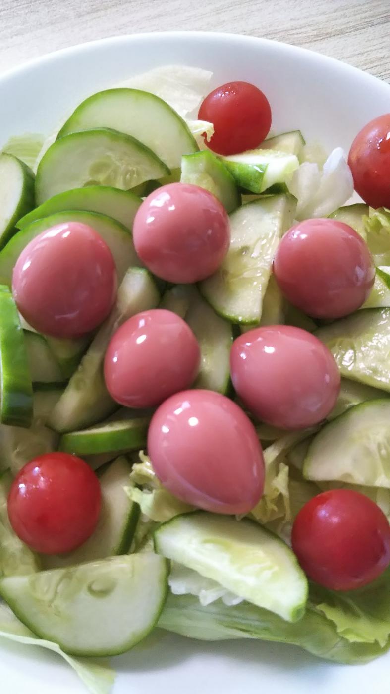 ハイビスカスすし酢に1日漬け込むだけで、ほんとに鮮やかなピンク色の卵が作れて、サラダがとても鮮やかになりました!
