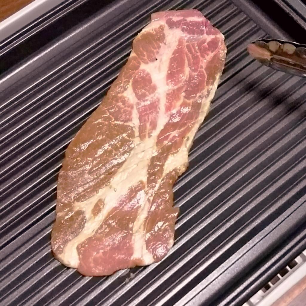 まずはもちろん焼肉でということで、ホットプレートの上でハサミで切り分けてから漬け込みダレを絡めながら焼きました。