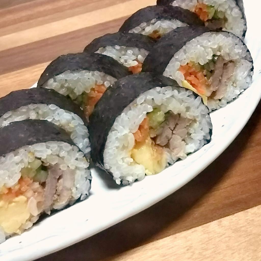 お肉・玉子焼き・お野菜のナムルと胡麻塩ごはんを韓国の海苔で巻きました。