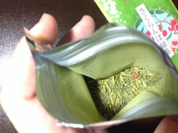 切り取り線の通りカットして覗くいてみると緑の茶葉の中にピンクの粒が。