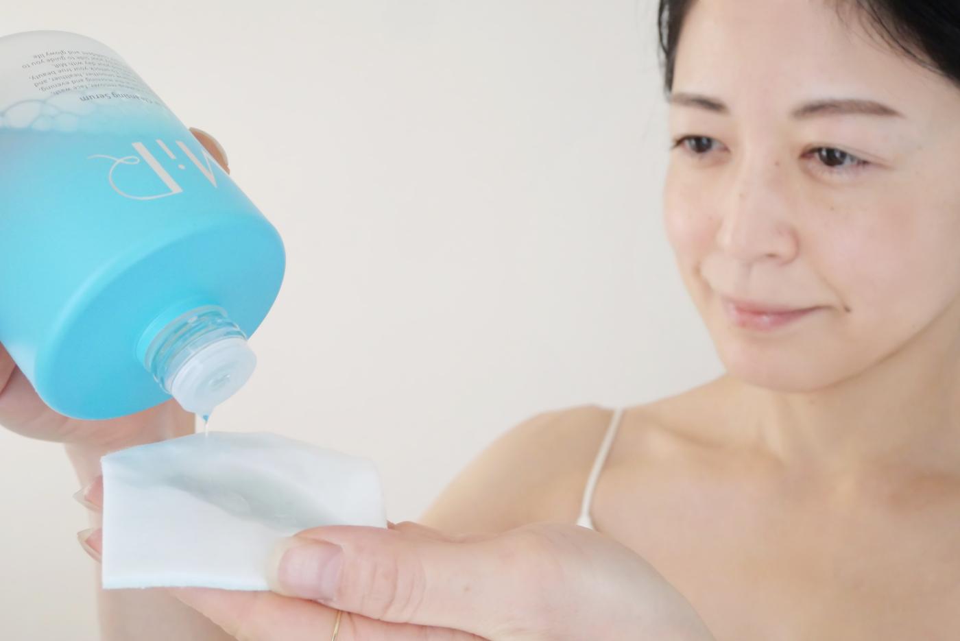 美容液みたいにとろみのあるテクスチャーで、コットンにとって肌にのせるとなめらかに広がる感じです。
