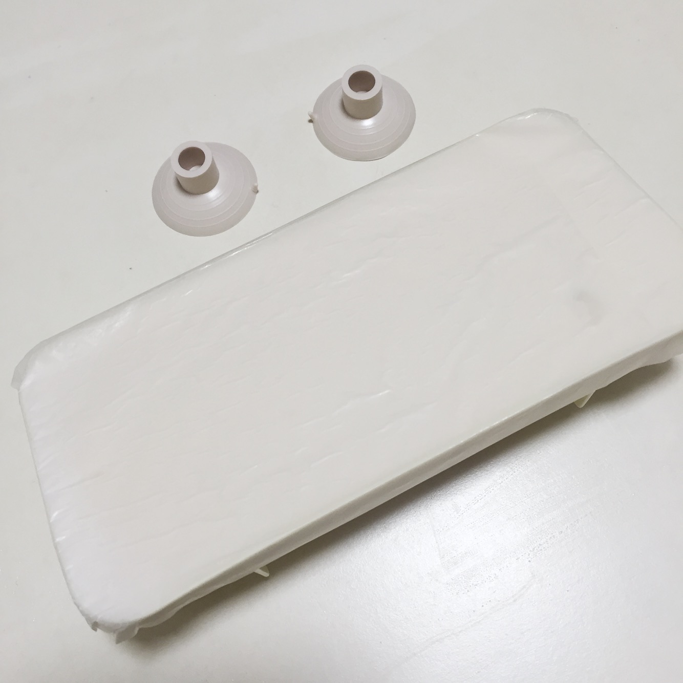 白く大きな四角い石鹸?のようなものと二つの吸盤が入っています。
