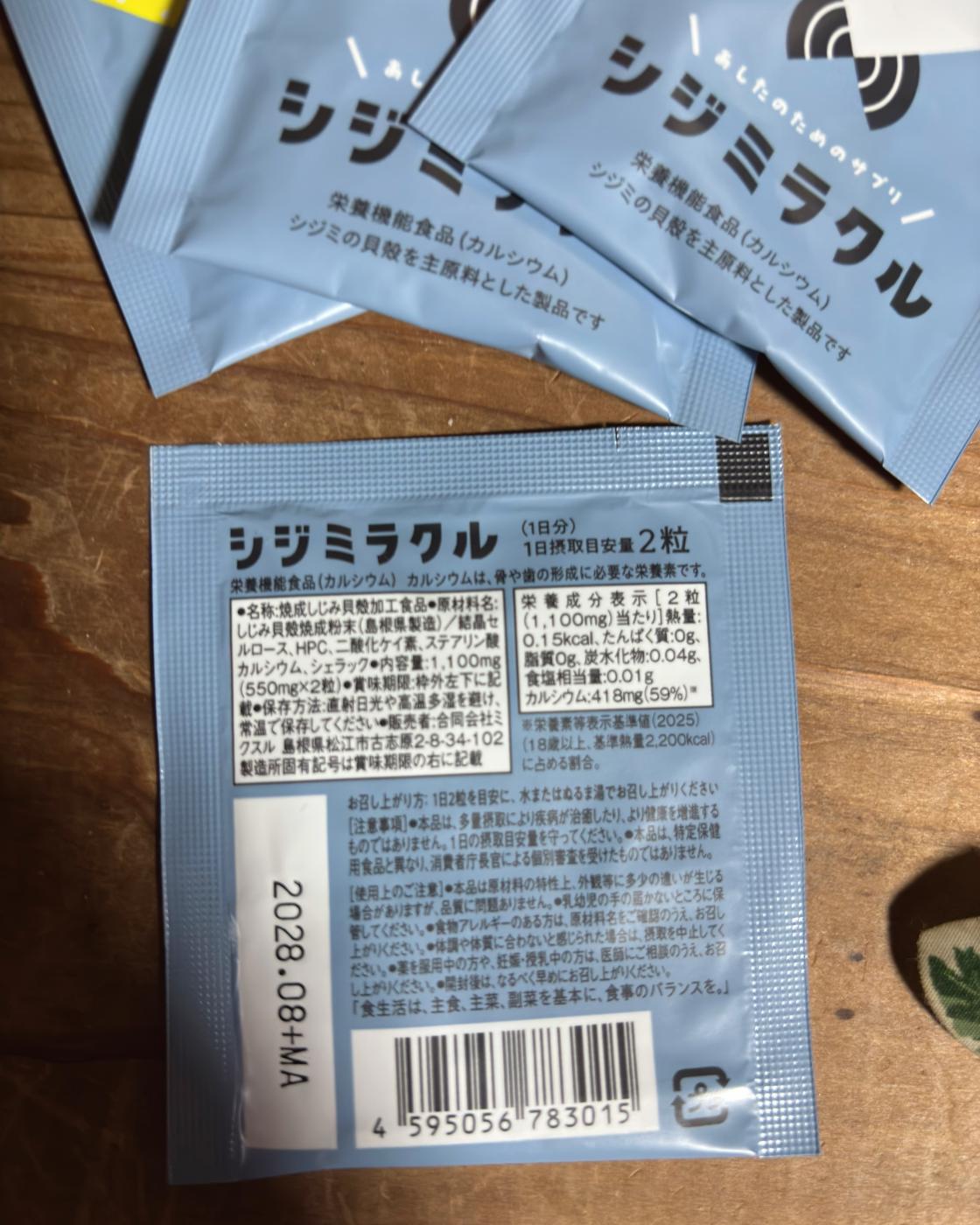 シジミ貝殻由来のカルサイトが配合されていて、2粒で1日の半分量のカルシウムを摂ることもできます✨