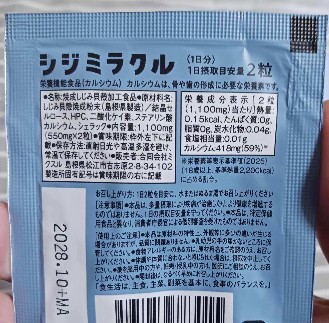 「シジミラクル」は、しじみ貝殻由来の成分を使用したサプリメントで、日常に取り入れやすい設計が特徴の商品です。1日2粒を目安に水などと一緒に飲むだけなので、忙しい日でも手軽に続けやすいと感じました。粒は小さめでつるんとした形状になっており、口に入れたときの違和感も少なく、サプリメントが苦手な方でも比較的飲みやすい印象です。